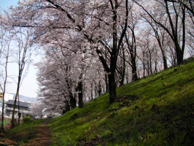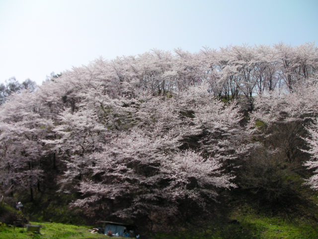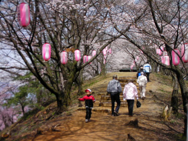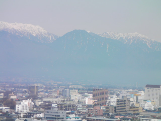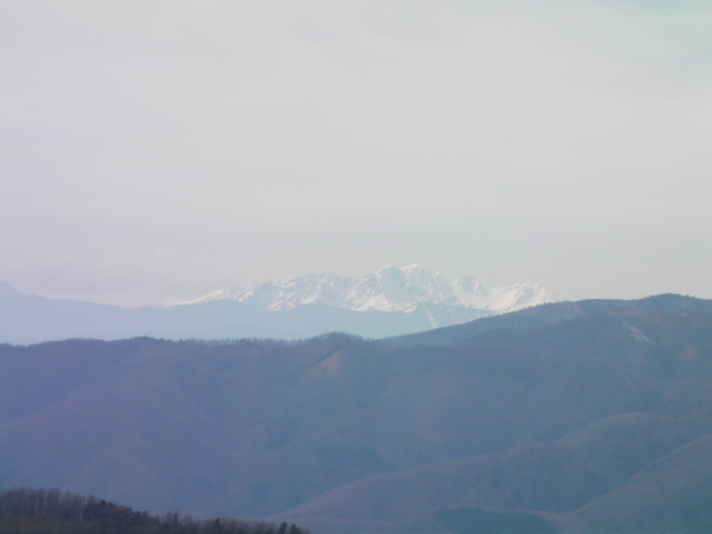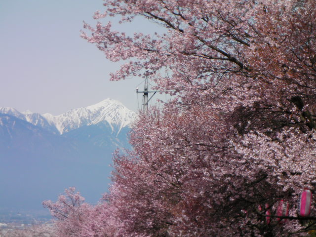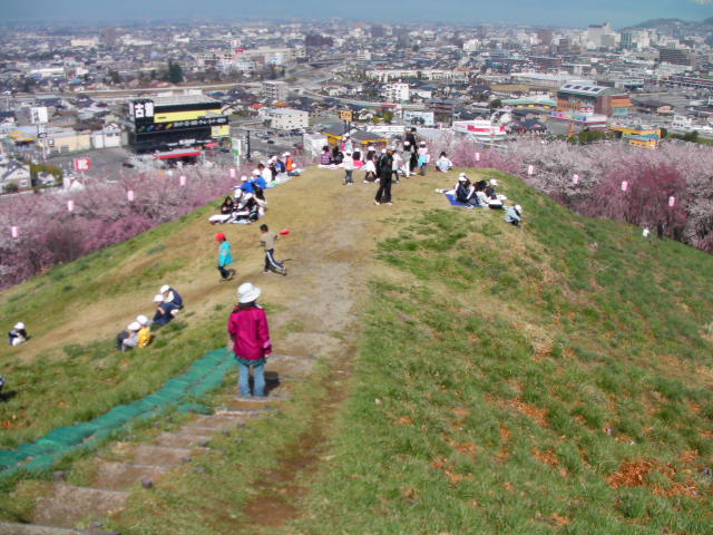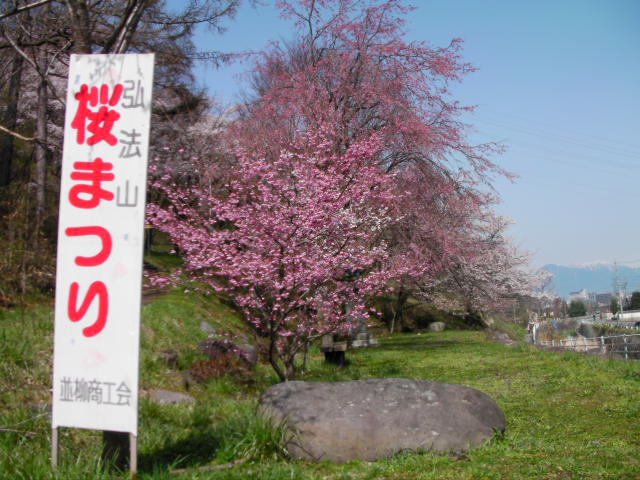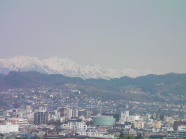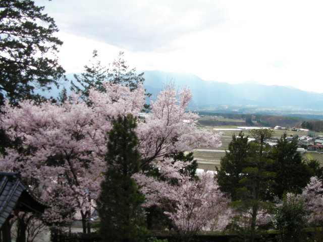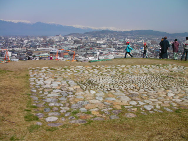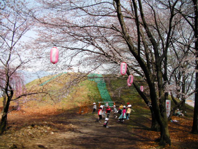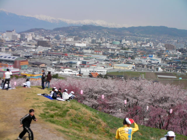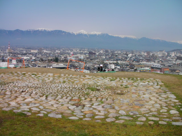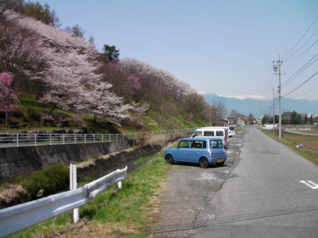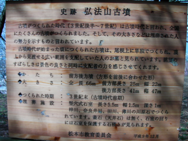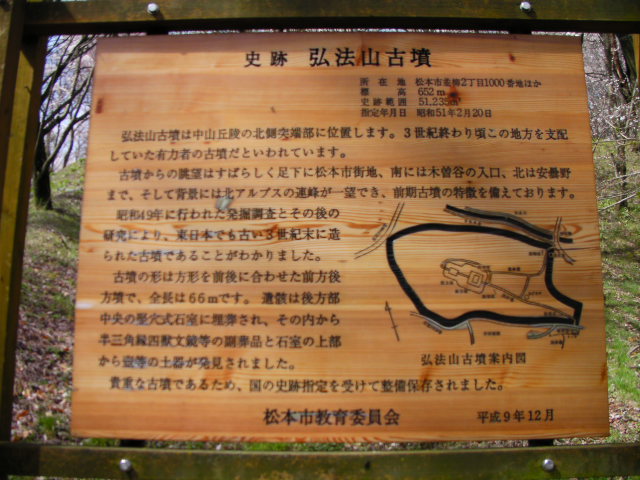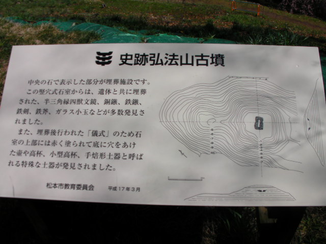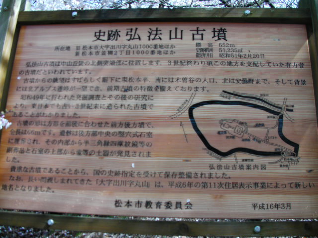 弘法山古墳は標高652mという小高い丘にあります。前方後方墳という珍しい形のようで、後方の石室のある所から撮影しています。25年位前に桜の植樹を始め、今では約2000本の桜があるそうです。小高い丘にあるので非常に眺めが良く、乗鞍岳、槍ヶ岳(穂先だけ)常念岳、爺ヶ岳、鹿島槍ヶ岳、五竜岳~白馬三山辺りまで見れました。地元の小学生でしょうか、大勢の子供たちが訪れていました。残念ながら桜はまだちょっと早かったかな?という感じでした。