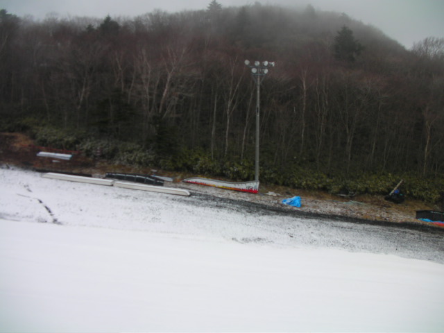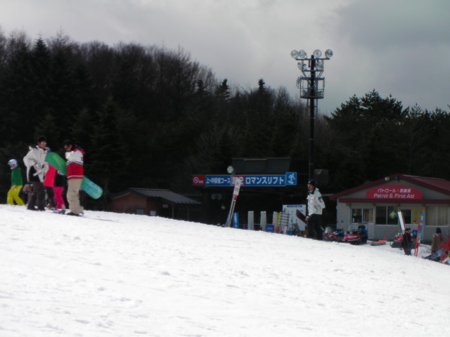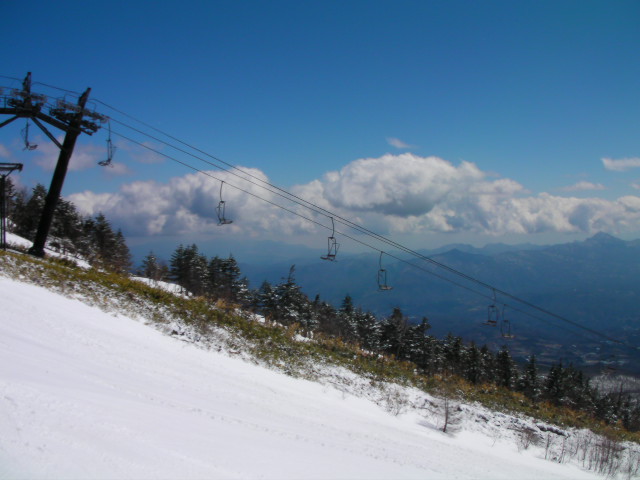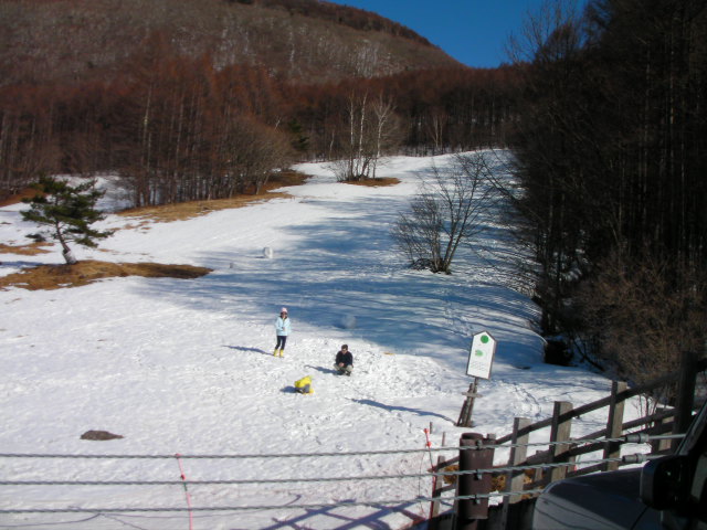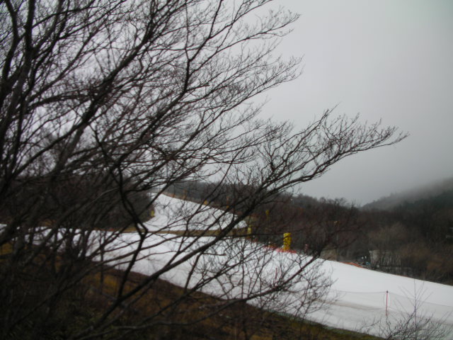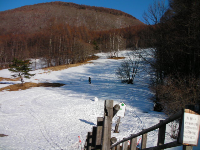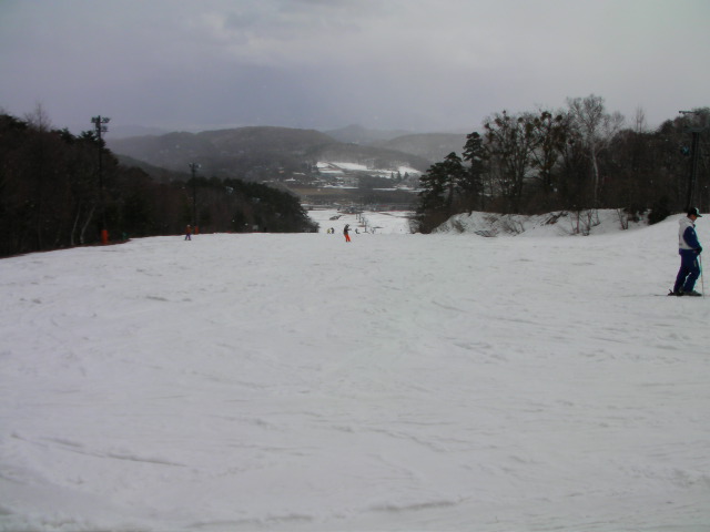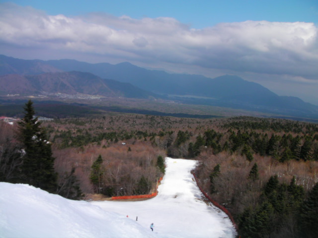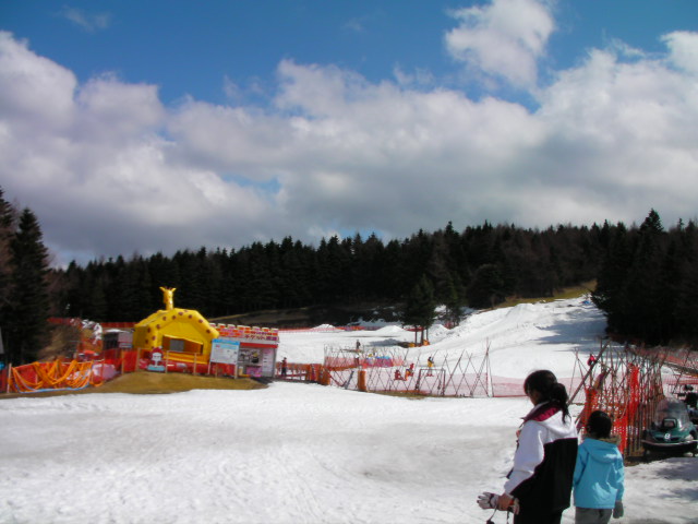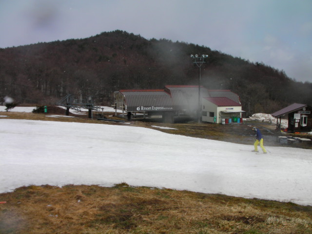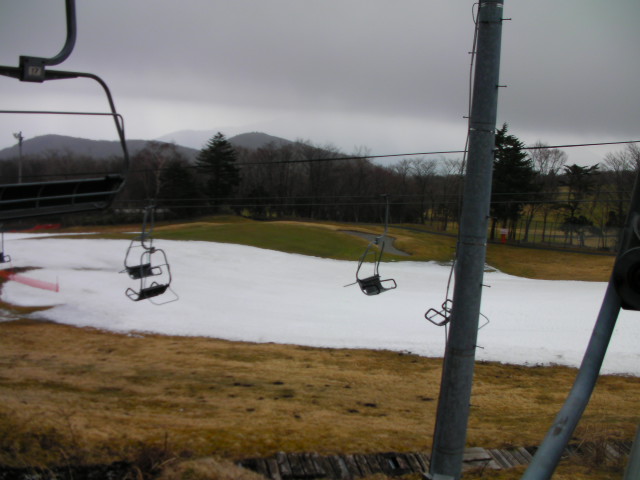 スキー場上部にセンターハウス等があり、直ぐに滑りだせる構造のスキー場です。軽井沢スノーパークと同じようにフェンスで囲まれ、関所があって必ずそこを通らないと入場できない仕組みになっていました。退場の際もその関所で1日券を回収されてしまいます。転売防止策でしょうか。再入場を希望する場合はTDRのような透明のスタンプを手の甲に付いて貰い、券を預けて退場するという徹底振りでした。さて朝一なので一番近いBコースを滑ってみました。ところが途中でAゲレンデに誘導されてしまいました。リフトに乗ってから判ったのですが、Bゲレンデは融雪してしまいコースに雪がありませんorzゴルフ場のグリーンとかが出てきていました。ゴルフ場オープンを優先するなら、今後雪付けはしないかも…?