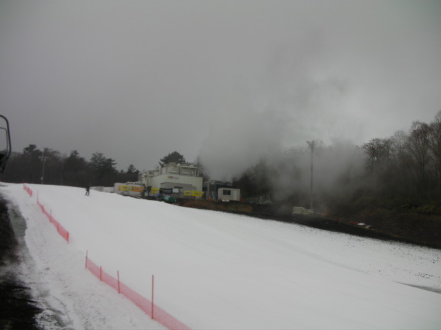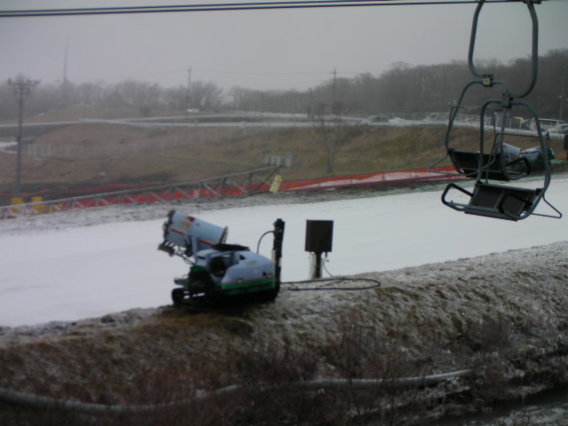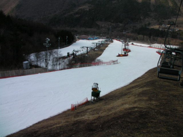 2本滑ったらCとDを滑るペアリフトが動き始めたので飛び乗りました。乗ってびっくり!Dゲレンデの下が僅かに切れているだけだと思っていたのが、上部は全面融雪していて雪が何もありませんorzかろうじてCの方だけは生き長らえさせようとスノーマシンで降雪したようでした。もっと長く滑れるコースかと思っていましたが、「あっ」と言う間に乗場へ到達してしまいましたorz