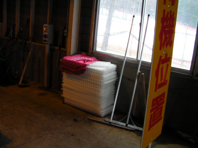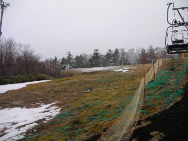 高速ペアを潜り反対側へ出て、スラロームコースの下部に当る初心者コースの滑走です。滑走者が少ない上に腐り雪なので妖怪足掴みの巣窟となっていました。危険箇所を示す竹竿だらけで、一応滑れるには滑れましたが、何度も繰り返し滑りたいという状態ではありませんでした。いくら春料金で@2000とは言え、クワッド・上部ペアが運休でコースがこんな状態では、お金を頂いて滑っていただく、という状態とは程遠い状態でした。