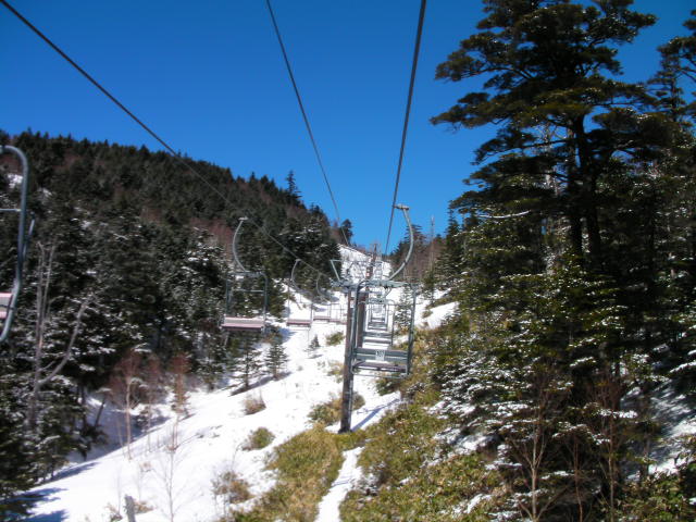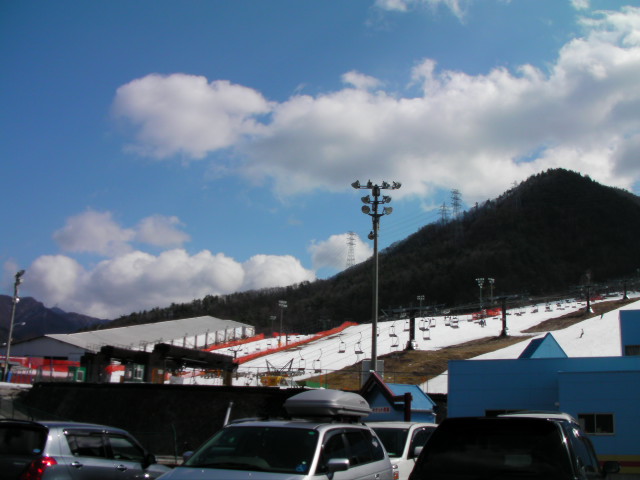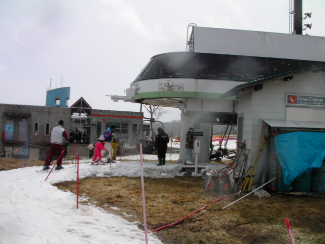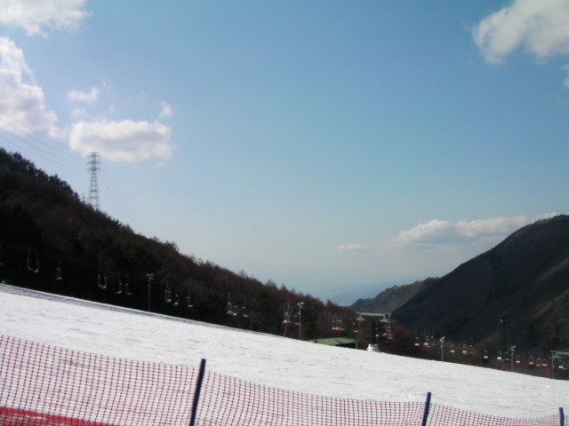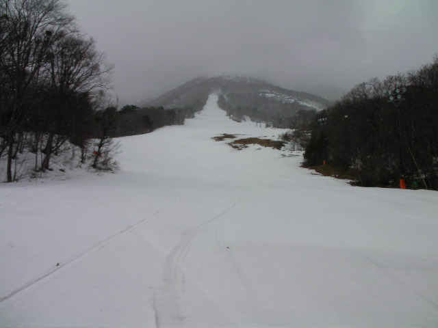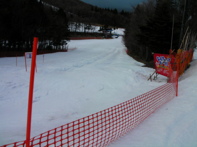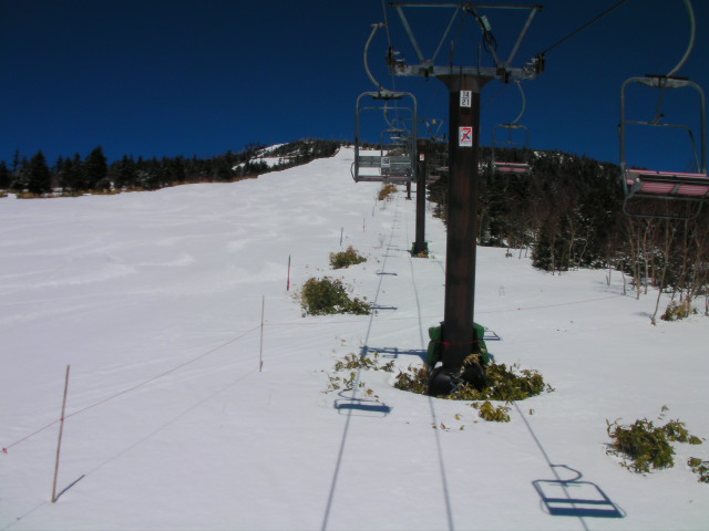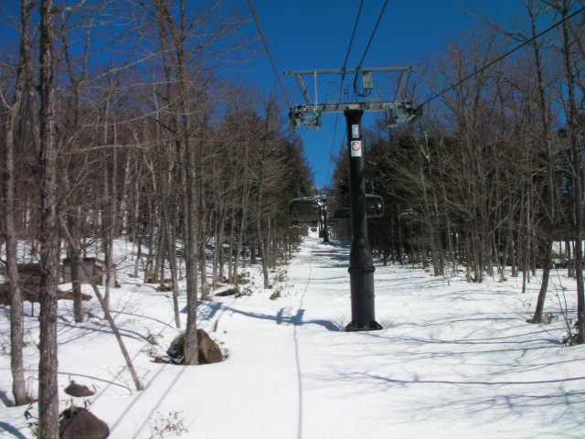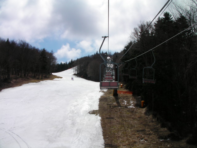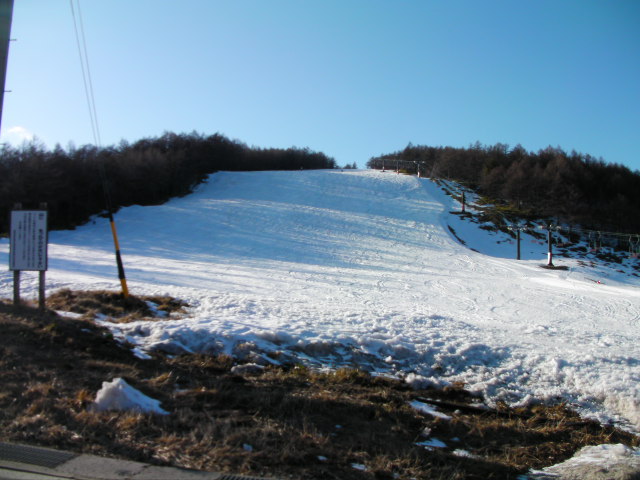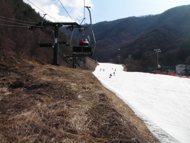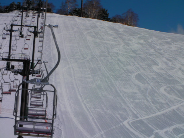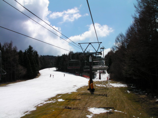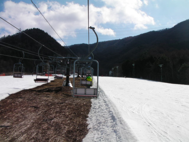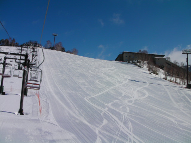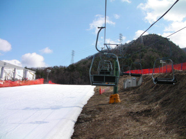 到着してビックリ。豊富な雪が残っていた黒姫とは対照的に地球が見え隠れする悲惨な状態でした。それに加えて大動脈のクワッドまで運休orz必然的に上部の第4ペアも運休でした。本日滑れるのは第2高速ペアを使った2コースのみ。ところがこの高速ペアも低速運転中orz自動循環で脱着がある分、普通の固定式ペアよりも時間がかかった感じでしたorzコースは上部の斜度のある部分はまだマシでしたが、下部の緩斜面になると、透け透けで所々切れた箇所もあり、特に乗場直前は幅5mほどが繋がっているだけで、正しく首の皮一枚状態でした。ちなみに明日3/22が最終日です。
