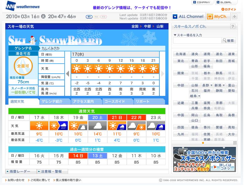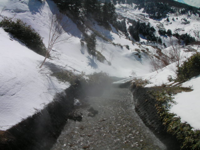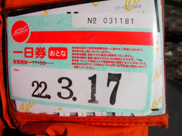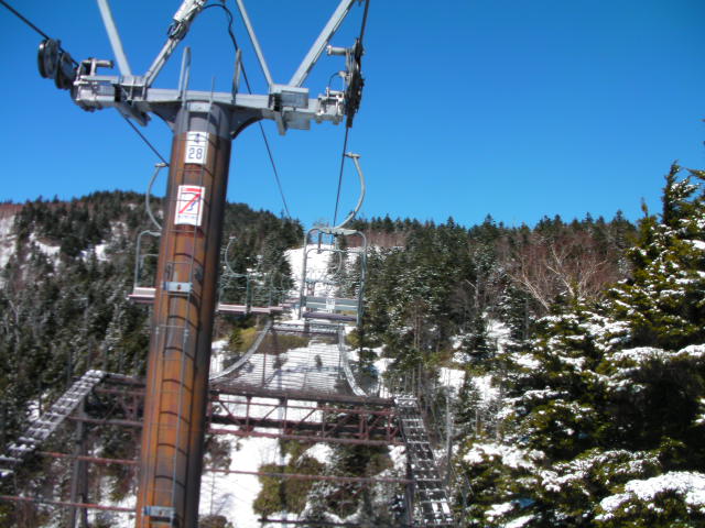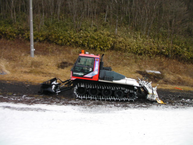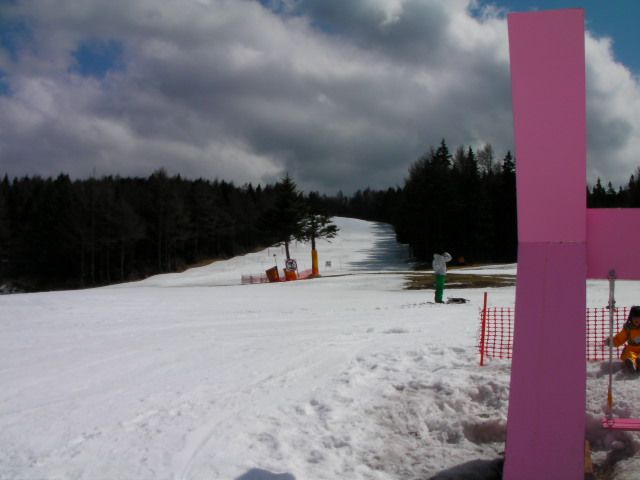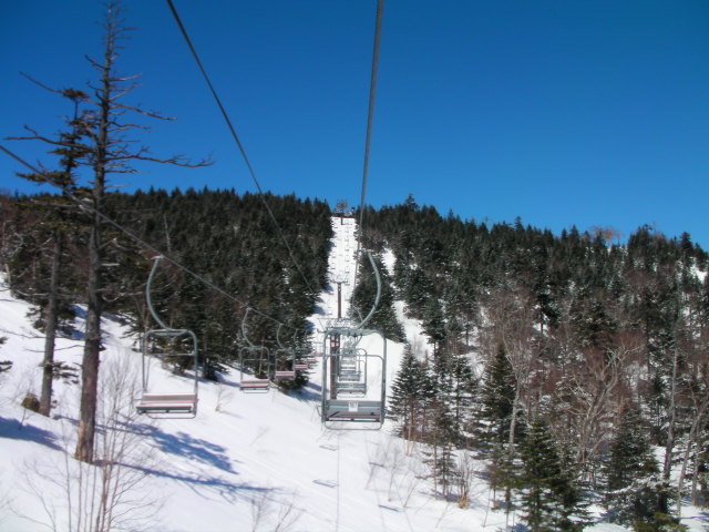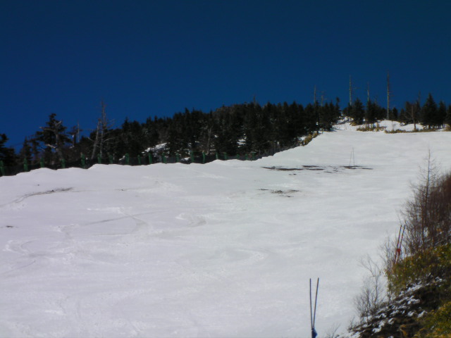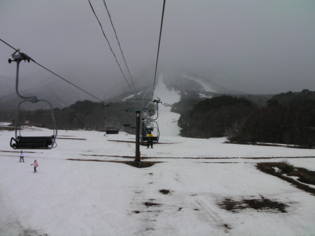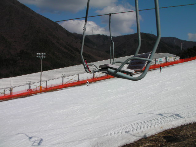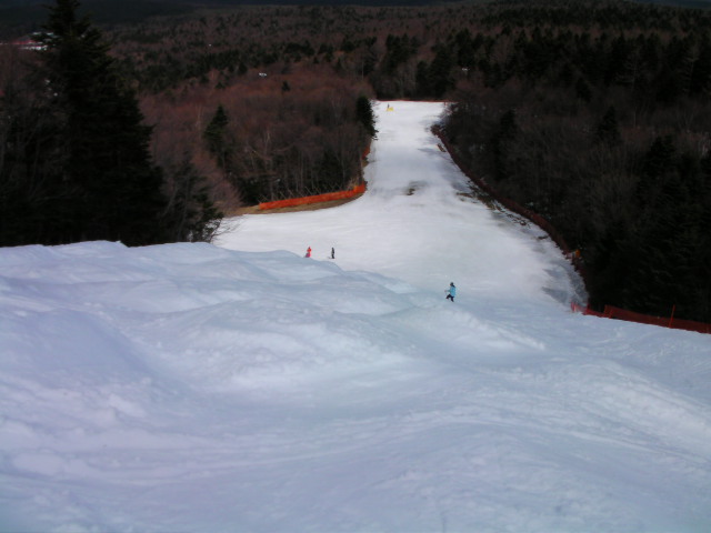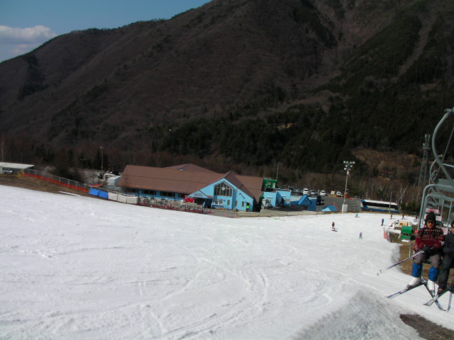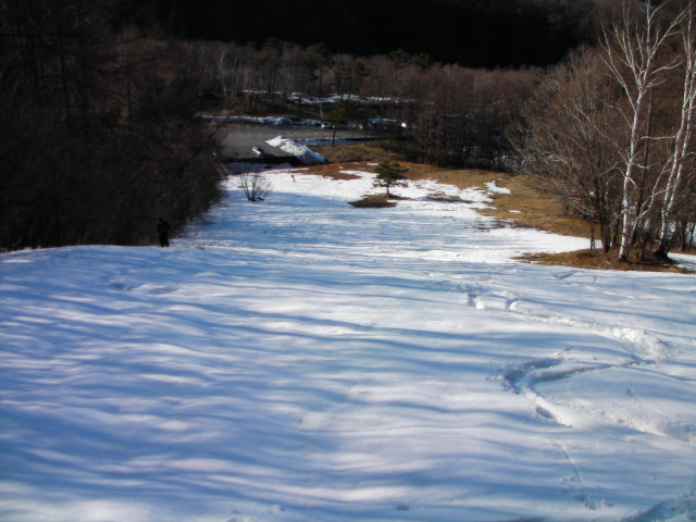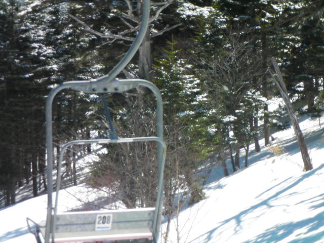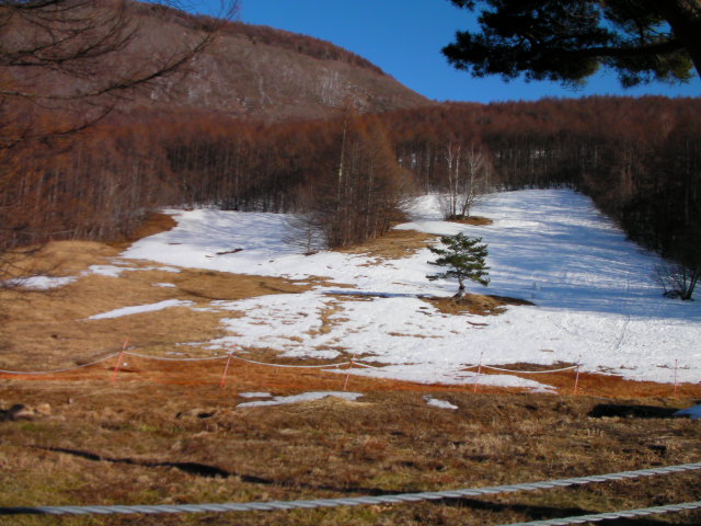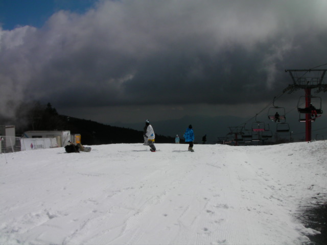 到着してビックリ。豊富な雪が残っていた黒姫とは対照的に地球が見え隠れする悲惨な状態でした。それに加えて大動脈のクワッドまで運休orz必然的に上部の第4ペアも運休でした。本日滑れるのは第2高速ペアを使った2コースのみ。ところがこの高速ペアも低速運転中orz自動循環で脱着がある分、普通の固定式ペアよりも時間がかかった感じでしたorzコースは上部の斜度のある部分はまだマシでしたが、下部の緩斜面になると、透け透けで所々切れた箇所もあり、特に乗場直前は幅5mほどが繋がっているだけで、正しく首の皮一枚状態でした。ちなみに明日3/22が最終日です。