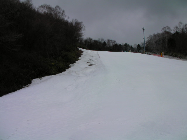 クワッドリフトを右手に降りて滑り出すダイナミックコースの滑走です。こちらも状態は似たり寄ったりでしたが、水浮きしたような箇所があって、凍っていて怖い部分もありました。滑走距離、斜面変化等滑って面白いコースだなぁと感じました。ハイシーズンなら相当楽しめそうでした。