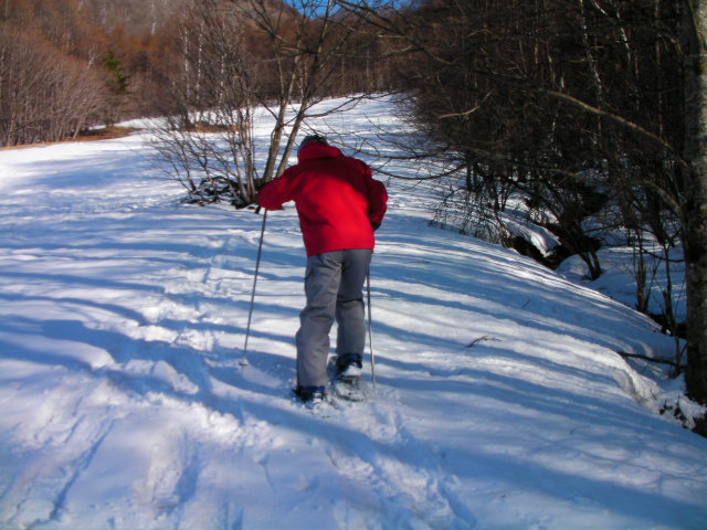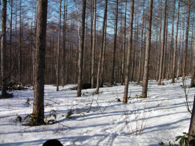 万座山ロマンスリフトで滑る万座山林間コースです。上部はロープの範囲内でプチツリーランも出来ました。中間部は幅の狭い所謂林間コースです。最後の登りには驚きました(苦笑)コース終了地点は万座山Gの中間に出ますので、似非クロスコースを楽しめます。この時間には既にざくざくになってきました。