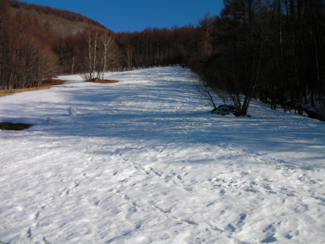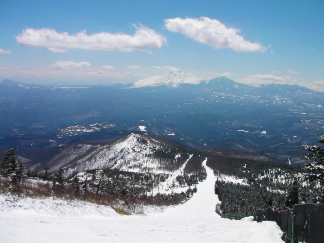 第3ペア1309mを使って滑るパノラマCの奥側です。手前側と平行に並んでいるので、他のスキー場から見た場合、表万座と特定できる特徴的なコースです。上から下まで同じ幅で同じ斜度というのも珍しいと思います。緩斜面になってからはパノラマの名に相応しく浅間山が真正面に見え非常に眺めの良いコースですね。息子共々1本滑っただけでお気に入りゲレンデに追加となりました(笑)こんなに素晴らしいのに何故こんなにガラガラなんでしょう?不思議です。