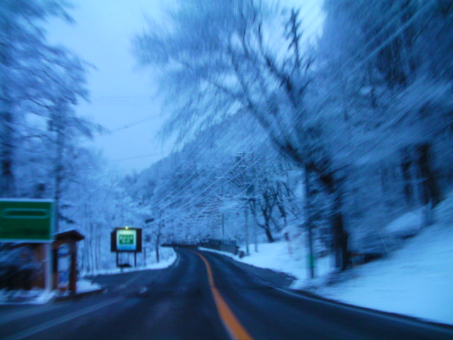 移動時路面状況=CA8のバッテリーが尽きて充電中なので携帯電話の動画機能での撮影です。朝は一面真っ白だった路面も大分融けてドライ~ウェット~シャーベットという感じでした。表万座まで約10kmの行程です。