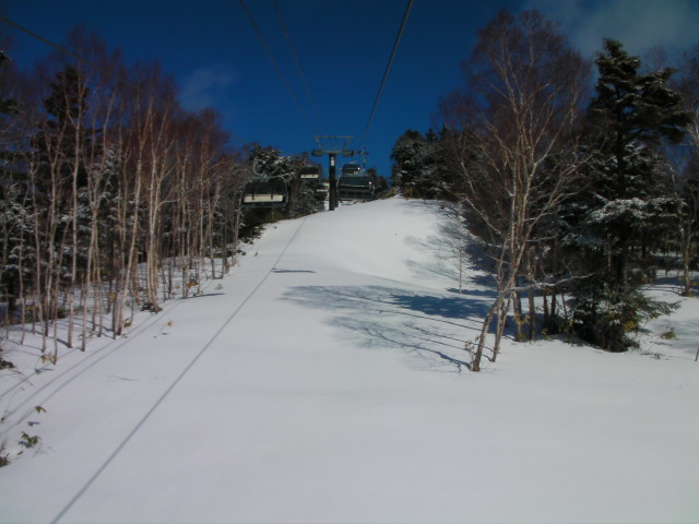 パラレルにかかるペアリフトを右手に降りて滑るレインボーCです。表面はざくざくで柔らかいものの、下地は硬くてしっかりしていたので踏み込んでも大丈夫でした。フラットな一枚バーンでカービング御用達ですね~。