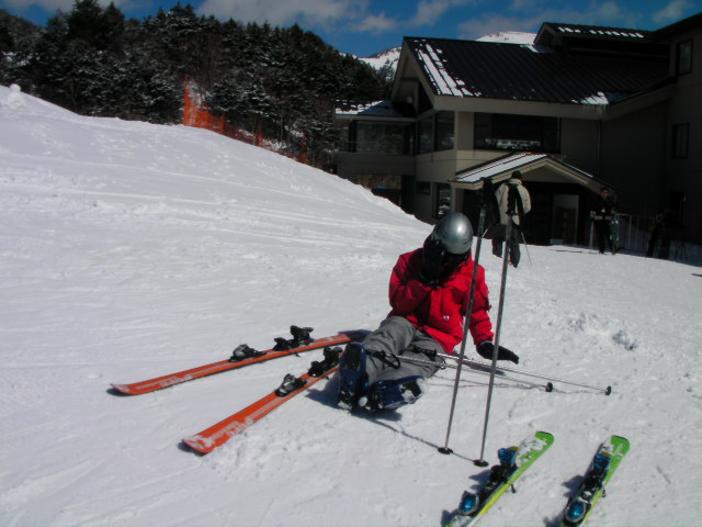 午後になって雪も大分緩み、B級モーグルコースも人が減ってきたので、エア台の無いラインにこっそり入ってみましたが、大会仕様の全長のようで、永遠に続くかと思うような長さでした。当然完走など出来るはずは無く、2回エスケープしてやっとの思いで滑りました。後で息子とモニターを見ながら余りに不様な滑りに大笑いしてしまいました(苦笑)