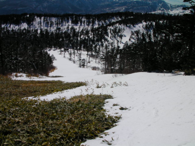 熊四郎Cを滑り、朝日山Gから板を担いでプリンスホテルまで戻り、ゲレンデを滑って駐車場まで戻るラストランです。熊四郎Cを1033に滑り出し、1053にここを滑り出しているので、20分ほどの行程で熊四郎Cを滑り歩いて戻ってこれたようです。この後は表万座に向かいます。