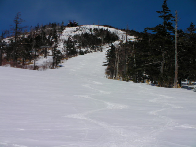 万座温泉で二つの上級表示の内の一つです。コースマップにも午前はまったいらの上級、午後はコブ上級と書かれていますが、確かに雪も柔らかく滑走者も多目なのでコブコブになるかも知れません。しかし距離が短いのでそう難易度は高くは無いと思います。