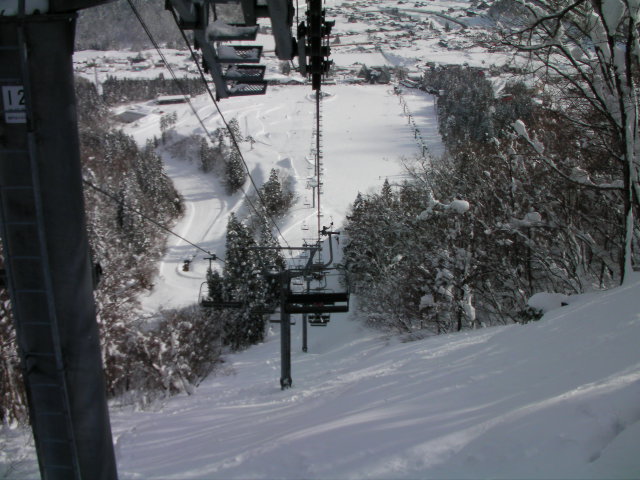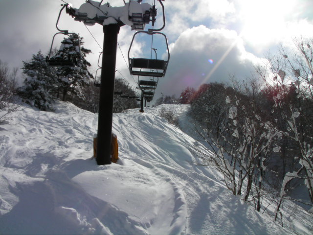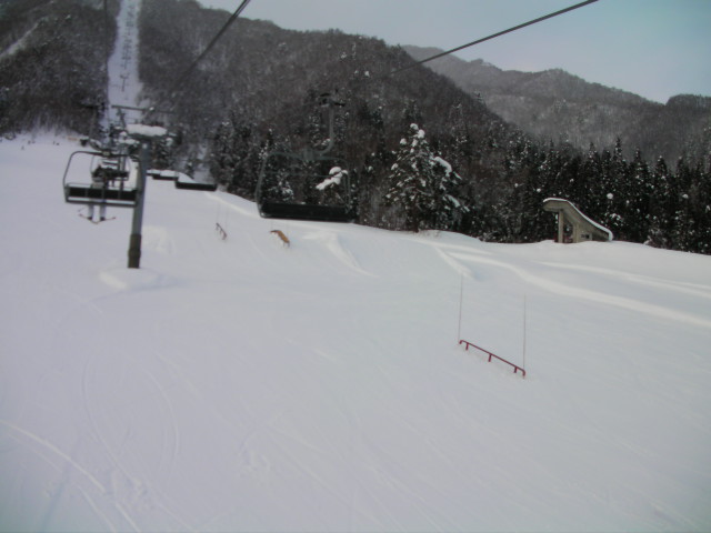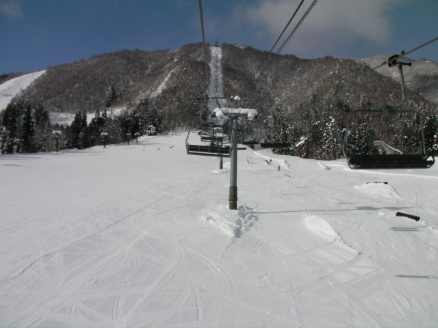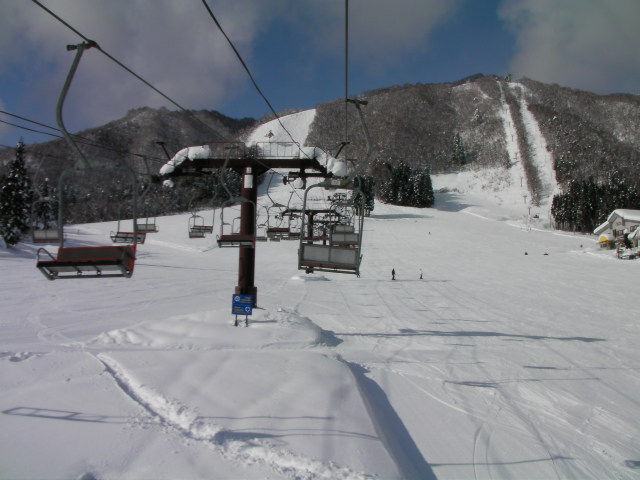 飛騨かわいスキー場の左側ゲレンデのリフト乗車風景と滑走です。右側のリフト乗り場まで滑っています。10時過ぎなのにピステンの跡がしっかり残っていて、人の少なさが判ります(苦笑)雪は極上の粉雪バーンでした。緩斜面ですがうねりがあって面白く感じました。