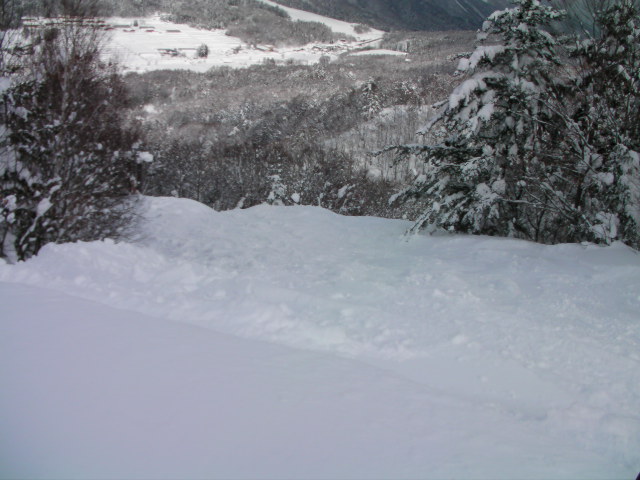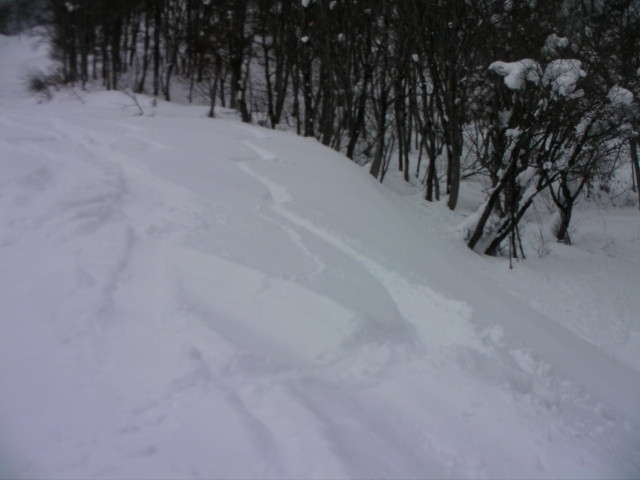 YANABA snow&greenparkの現状のゲレンデに直角方向にあった廃ゲレンデです。ヤナバビレッジというペンション地区側から、アルペントレッカーとシールを使って登ってみました。 積雪は推定100cm+ほどあったと思います。上部は表面2~3cmがクラストしていて最中雪でしたが、下部の斜度の無い所はフカフカでした。