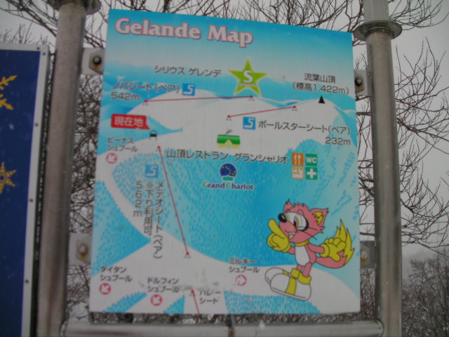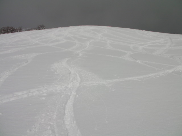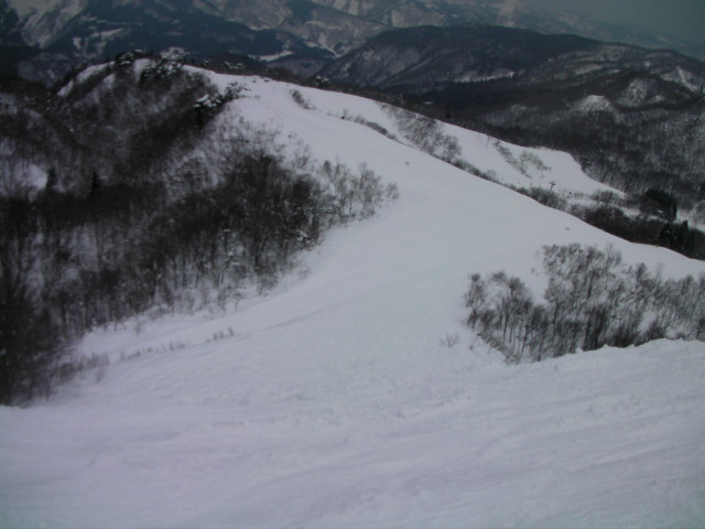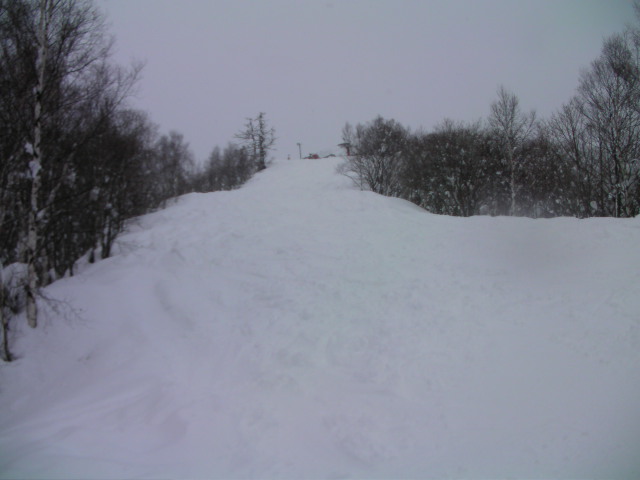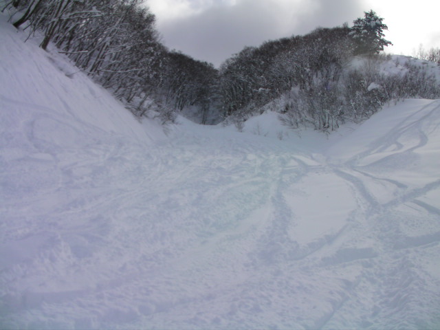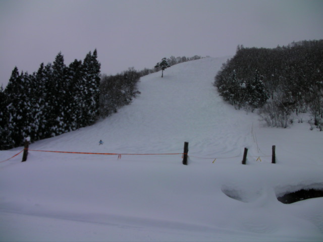 山頂ゲレンデはリフトの間なら何処を滑ってもOKのようです。一応山頂谷コースと勝手に呼んでは居ますが、山頂裏全体がコースのようなものなので、公式なマップにはコース名すらありません(苦笑)圧雪は谷底のフォールラインを車幅分1回踏んだような感じでした。尚表面の下山ルートはコース外、リフト線下は滑走禁止が明記されており、違反者は「用具を没収します」と怖いことが書いてありました。リフト券没収は良く見ますが、用具没収は初めて見たかも?
