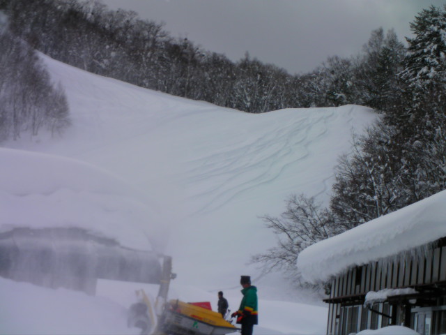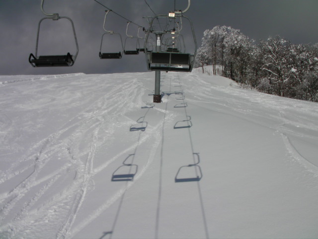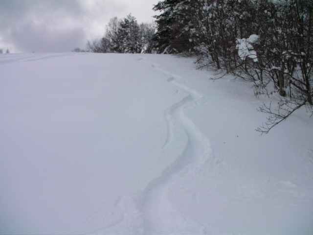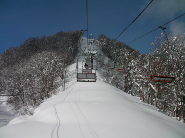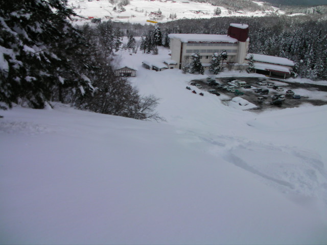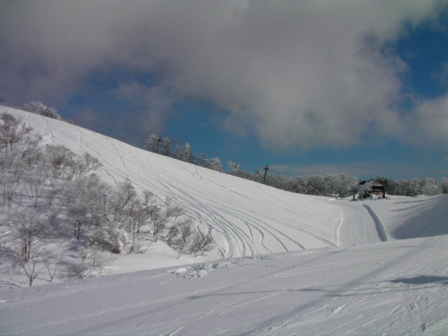 昼休みに新雪を滑ってみました。20班以上の先生が居ましたがどなたも新雪はお好きでないようで?新雪ゾーンを滑ったのは私だけでした。雪は軽くてドライパウダー間違いなし!でしたが、硬い底当り感があり残念!!