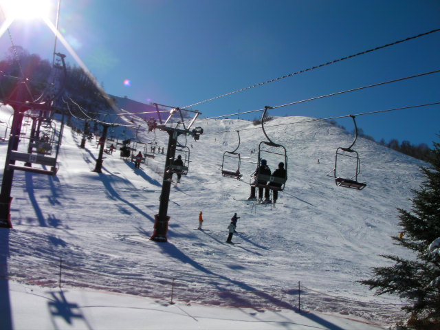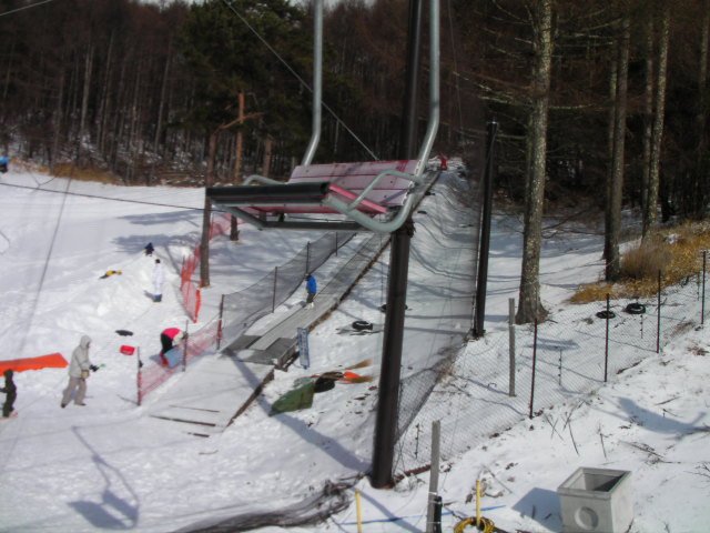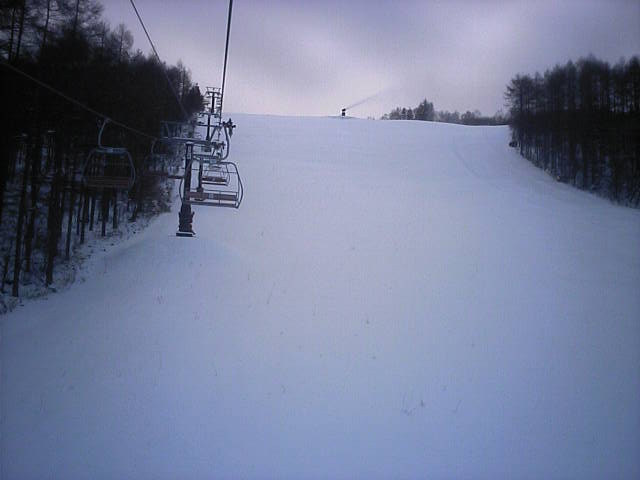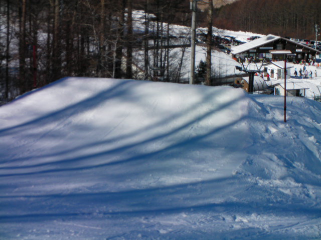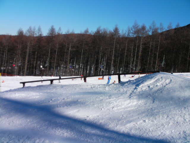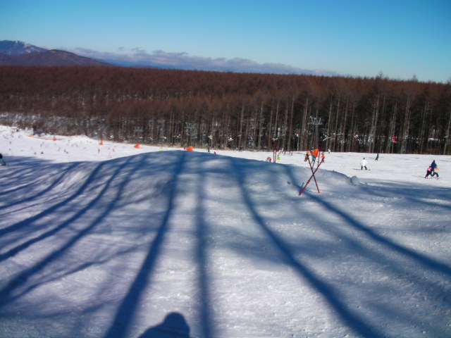 全長700m平均斜度10度のドリームコースの滑走です。雪は薄いものの、ここは下地にプラマットが敷いてあるので地雷の心配はありませんでした。幅も狭目でしたがサイドカーブの範囲よりはありました。人工雪なので硬いのを覚悟していましたが、意外に硬くなくエッジがしっかり食いつきレールターンが容易にできる位の硬さでした。この時間はゲレンデに日が当っていますが、14時過ぎには林の影が伸びてきました。想像していたよりは良い感じの雪でした。
