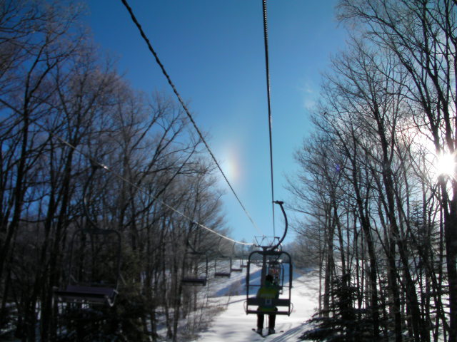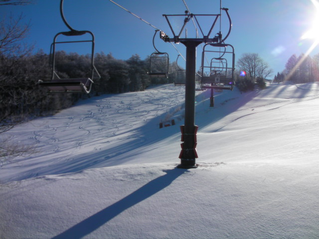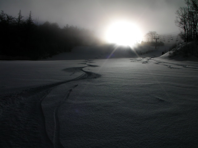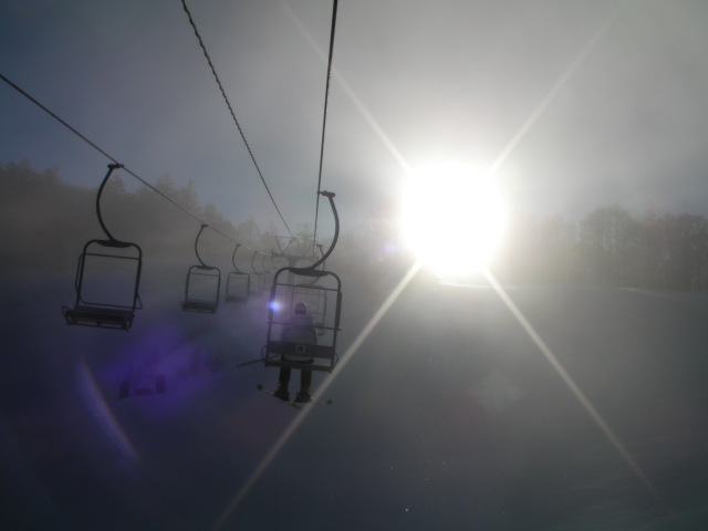 リフト乗車中に、霧が出て少し幻想的な風景と1stトラックを撮影してみました。気温は-5℃位でしたが、霧が凍って太陽の光に反射してキラキラと綺麗でした。似非ダイヤモンドダスト。