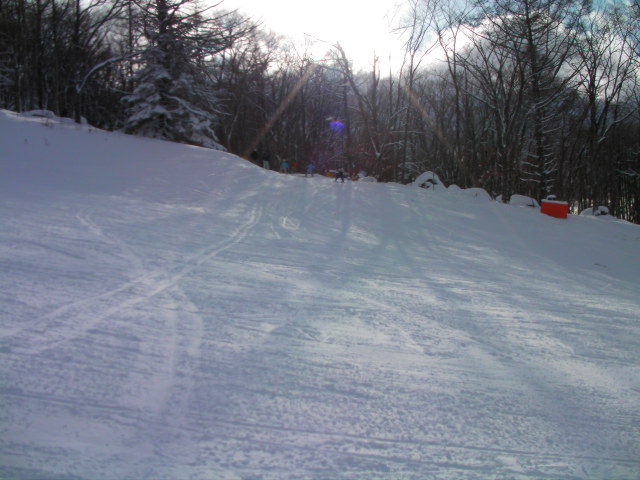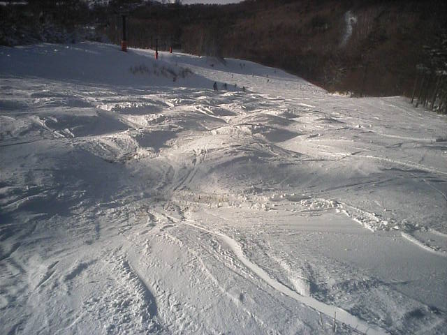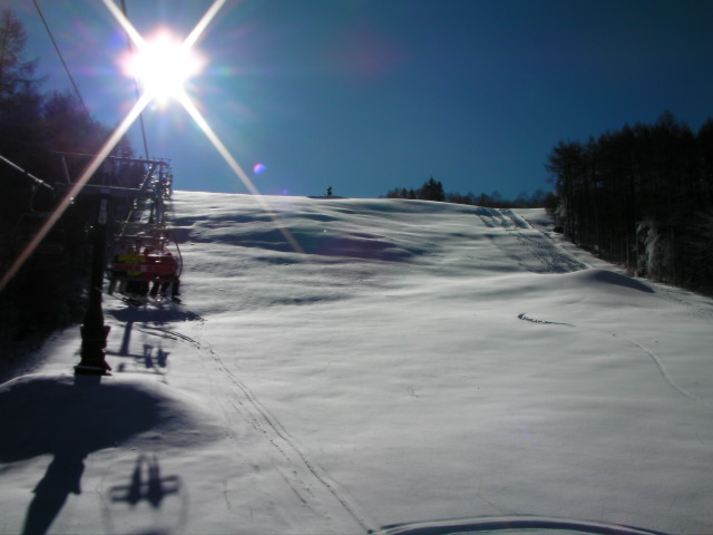 南斜面なので、融けて再凍結して硬い事もありますが今日は上部に比べればほど良い硬さでした。スキーデビューするには長さ、斜度的に良いバーンだと思います。ここは昼間はボード禁止なので安心感もあると思います。
