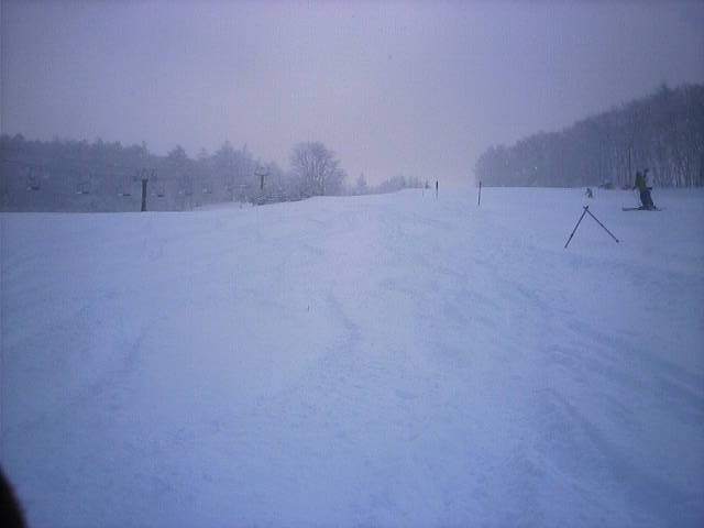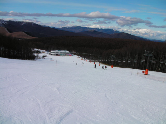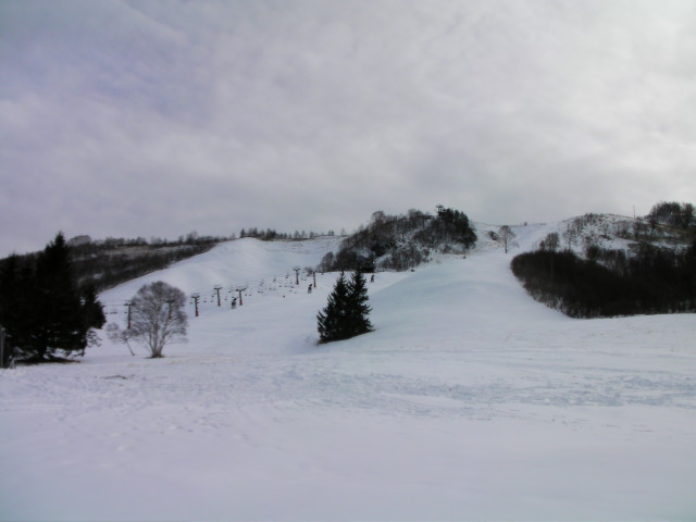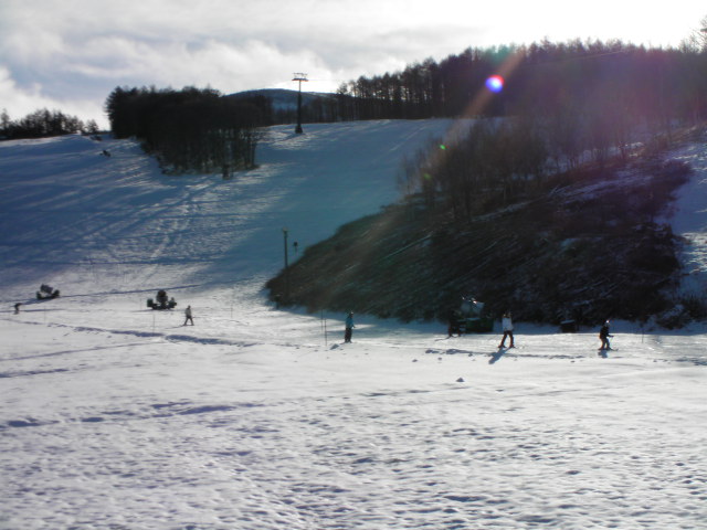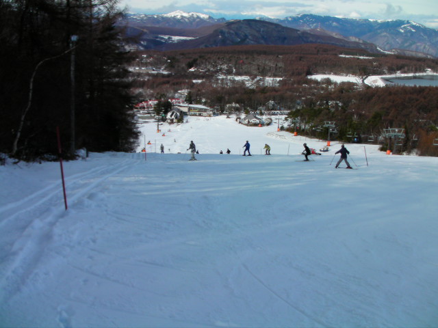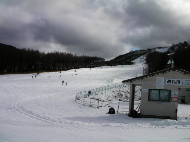 午後になって雲が多くなり、風も強くなって寒くなりました。人工雪主体のコースなのでガリガリになっており、白樺湖界隈と変わらないような状態になっていました。バーン自体はフラットな斜面で斜度変化の無いバーンでした。