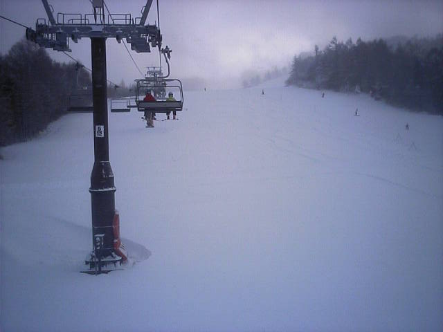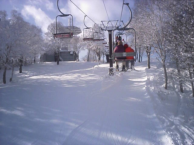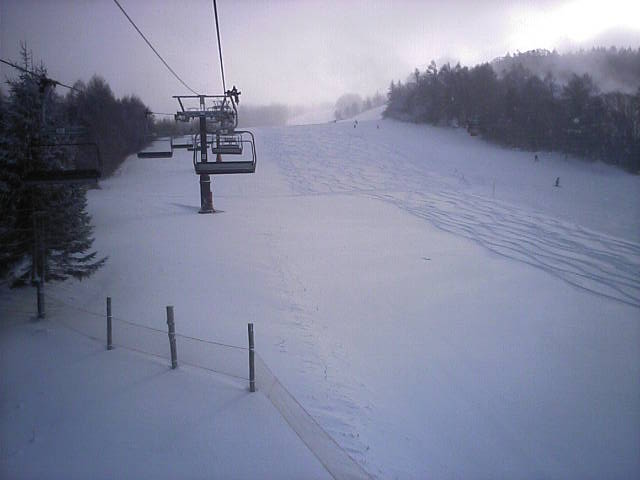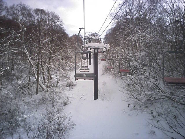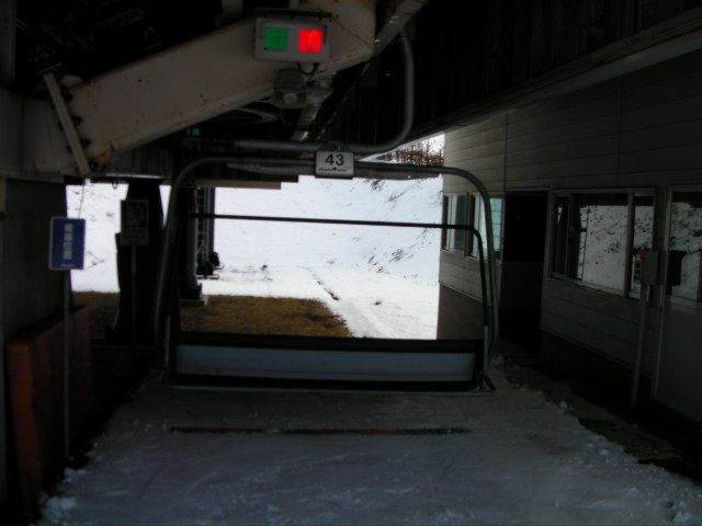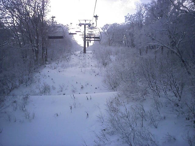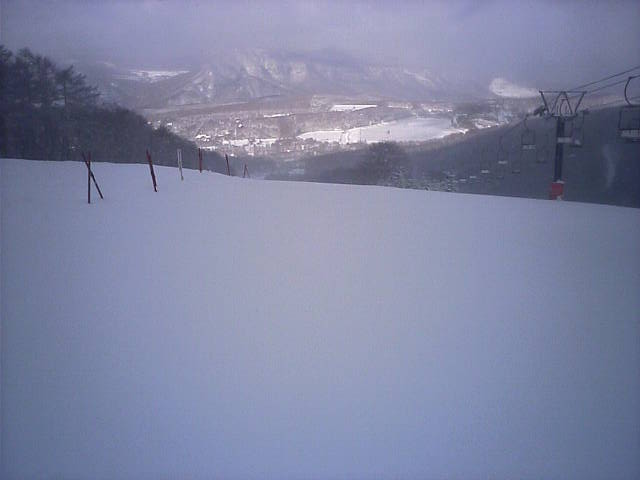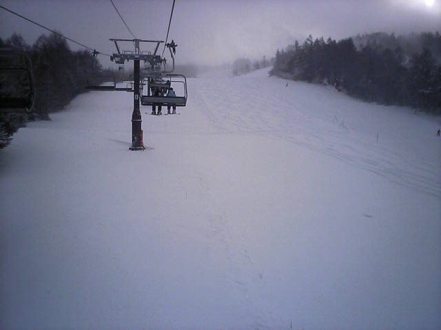 リフトから見たゲレンデの様子です。スキーヤーは数えるほどで大半がボーダーでした。雪が硬めなのでコース幅規制のポールの外側に多少出ても地面の露出はありませんでした。ランラーンにはピステンの踏み跡らしきものがありましたので、今週末クワッドが動くかも知れません。