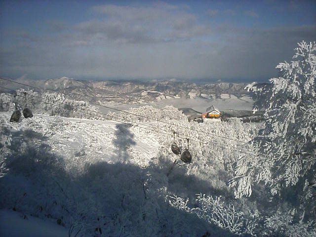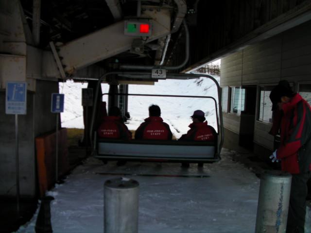 本日OPENの白樺高原国際スキー場です。待ち遠しくてリフト営業前からゲートで並んで待ちました。リフトスタッフの方々が登っていき、山頂に格納されている搬器の取り付けを始める所です。