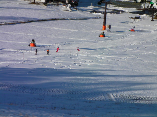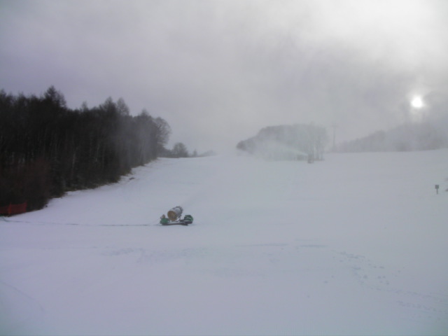 気温が低いままだったので昼になってもスノーマシンは雪を吐き続けていました。ピステンも何往復か踏んでいましたので、週末にはゴンドラの運行が始まりそうです。やや硬めの粉雪だったので然程荒れてはこなかったです。下部の幅も広がったので大分良くなりました。