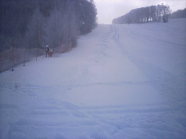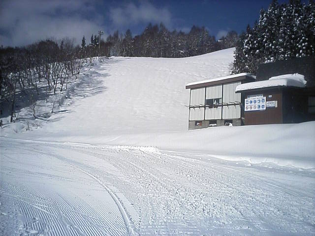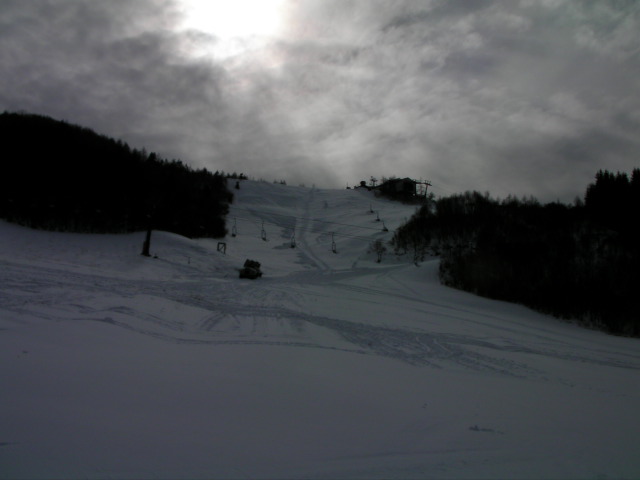 ここのシーズン券は日券との引き換え無で使えるので、窓口が開く前からリフトに並び1番機と1番滑走がゲットできました。昨日自然降雪があったので広く滑れるように見えますが、実際は20~10m程度の幅で窮屈感がありました。雪質は硬めでしたがアイスバーンはありませんでした。