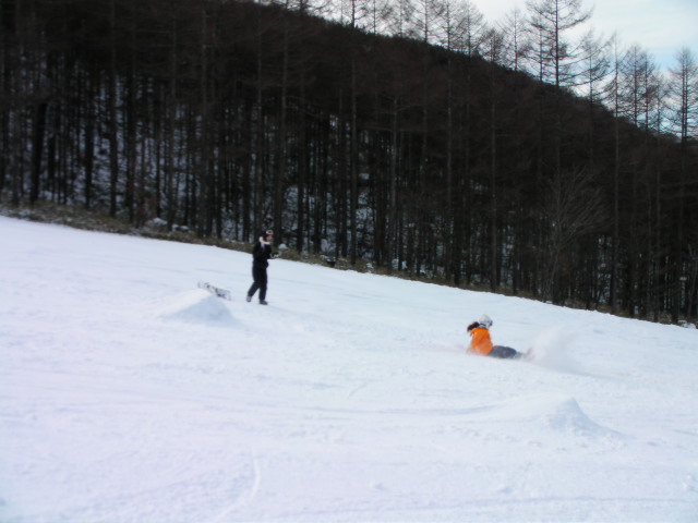 こちらでも早速杖無し手ぶら隊のmotoさんを捕獲できたので、背後からストーカー。ここは幅は有りますが、肝心な斜度が無いのでEXCには辛いところ。しかし流石Vuirs乗り。シーズン初めからベッタリ倒れていました!