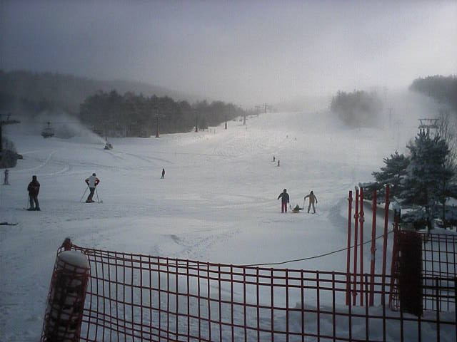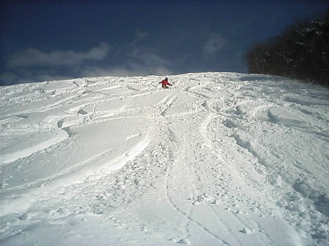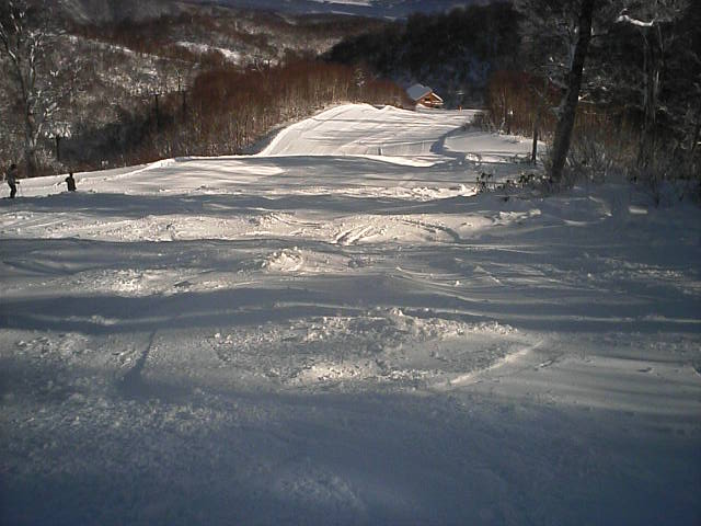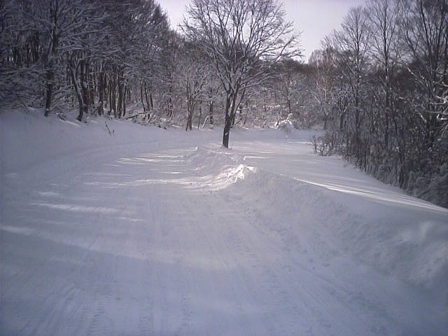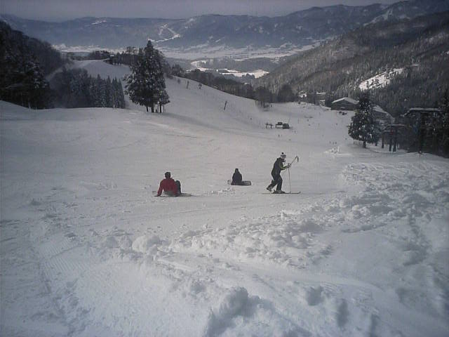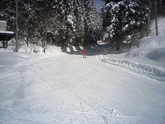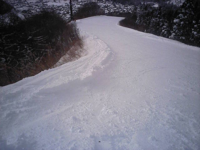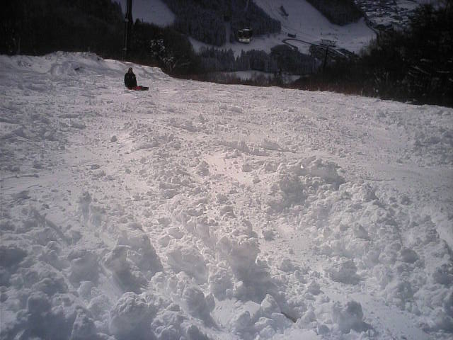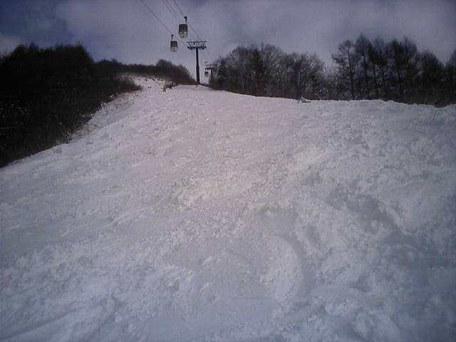 もうひとつオープンしたプレジャーゲレンデです。こちらがメインゲレンデになるので滑走者も多く、柔らかい湿雪なので荒れるのも早かったようです。こちらも昨日の自然降雪で幅広く見えますが実質20~30m位だと思います。近所で同業者のイントラDK君兄弟が滑りに来ていました。彼のホームはロイヒだが???