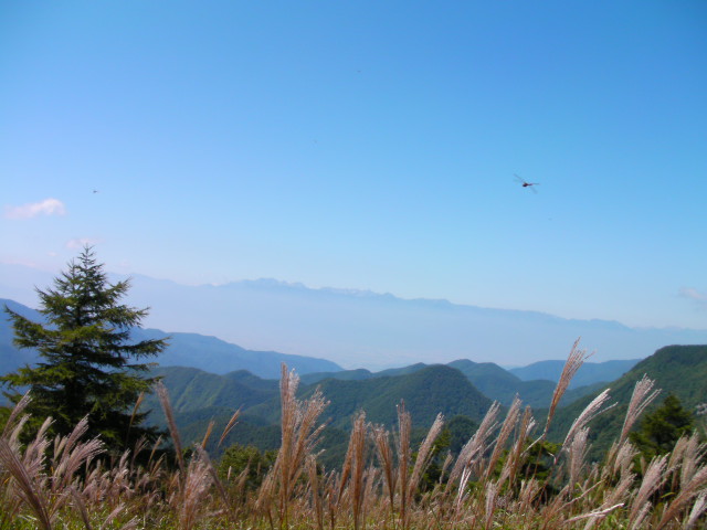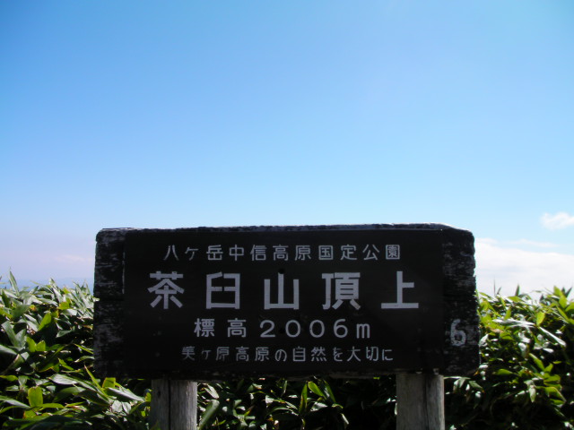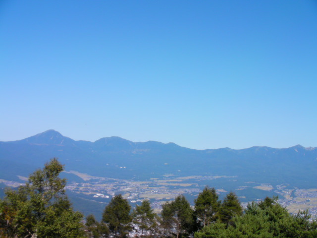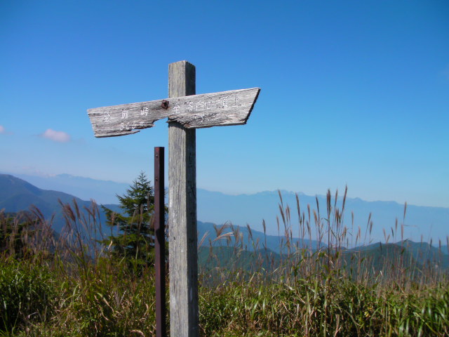 尾根道をアップダウンを繰り返しながら最後の急坂を登ると山頂です。尾根道は樹林が少なく東側の浅間山系、西側の北アルプス山系、真後ろの南側の八ヶ岳(南アルプス山系)を眺めながら快適な山行でした。しかし山頂は北~西方向は樹林帯があって北アルプス方向の眺望が無く、ちょっと残念でした。途中岩ゴロ急登の部分もあり山歩きと言うよりは登山!という感じで結構ハードでした。