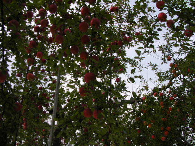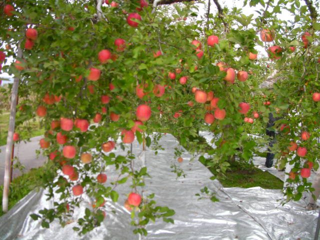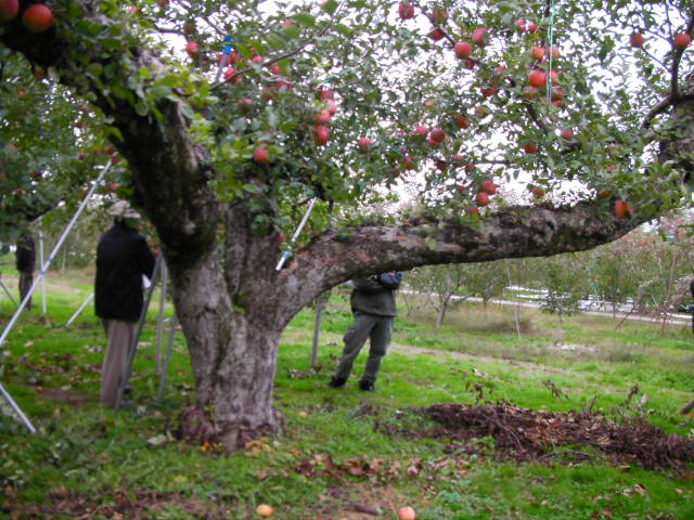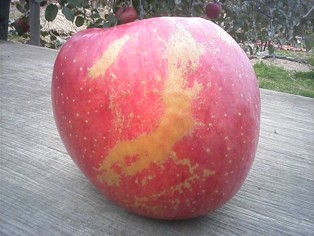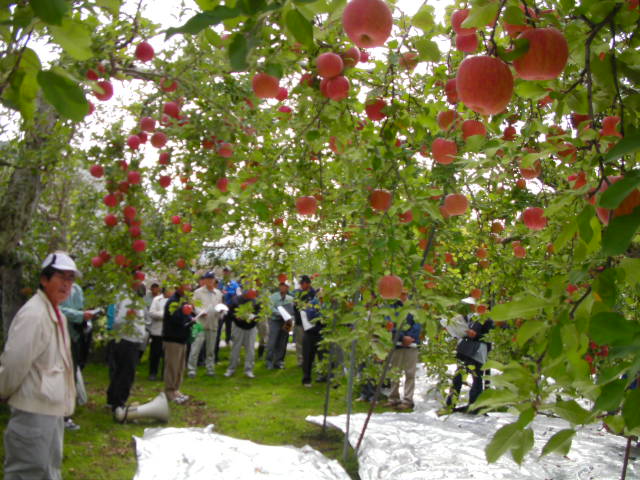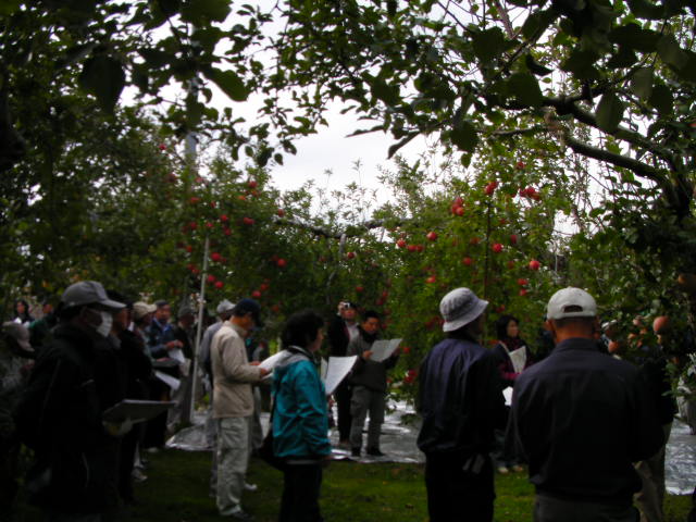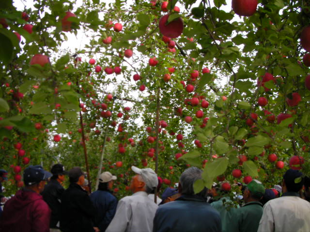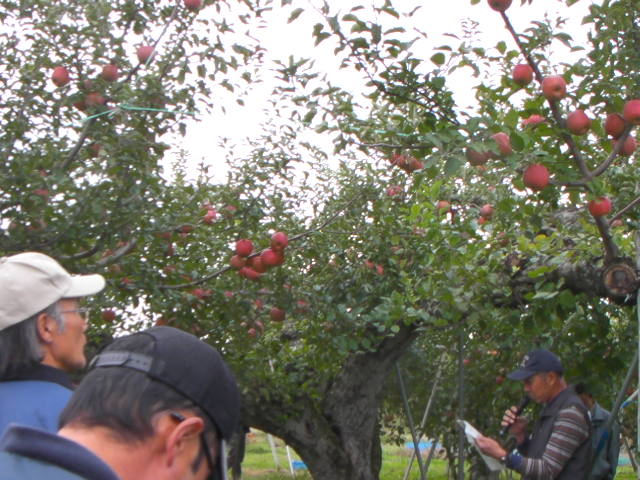 長野市真島地区にて行われた高品質ふじ生産に関する研究会で、長野県のふじの原木となった普通樹を見ることができた。当時の呼び 名は「東北7号」。長野県のりんごの60%以上を占めるふじもこの樹1本から始まったとのこと。その後長ふ2や12などの着色系 も発見されてはいるが、すべてこの樹が原点。元々ふじは着色に難ありとのことだったが、この原木を見る限りそこそこ良い着色度合 いだった。