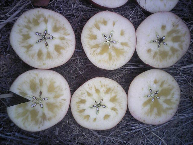 通常ふじの蜜入りはアンコ状に芯の周りに固まって入るのだが、今年は霜降り状に果肉全体に回っている物が多いような気がする。これは自宅園地の果実だが、箕輪園地では皮の直下まで達しているものもあった。