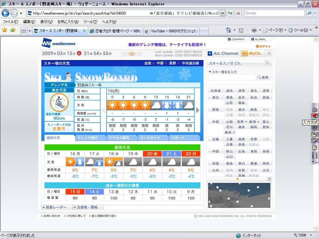 13:34~瀕死の中社ゲレンデを滑走。明日090322まででコース閉鎖するとの事。