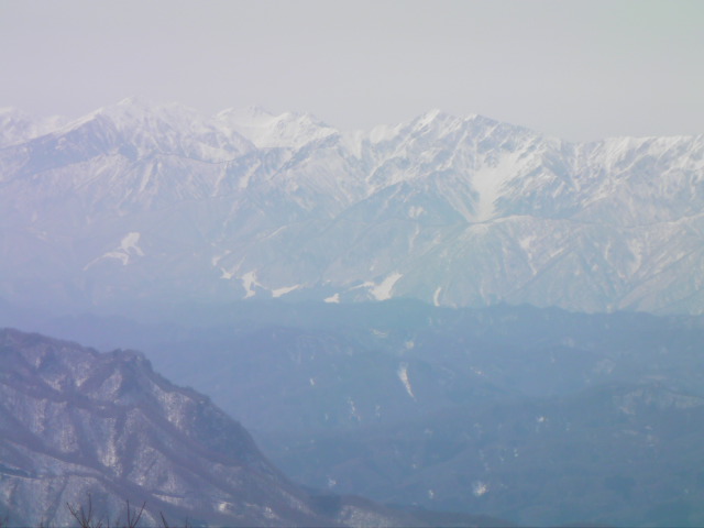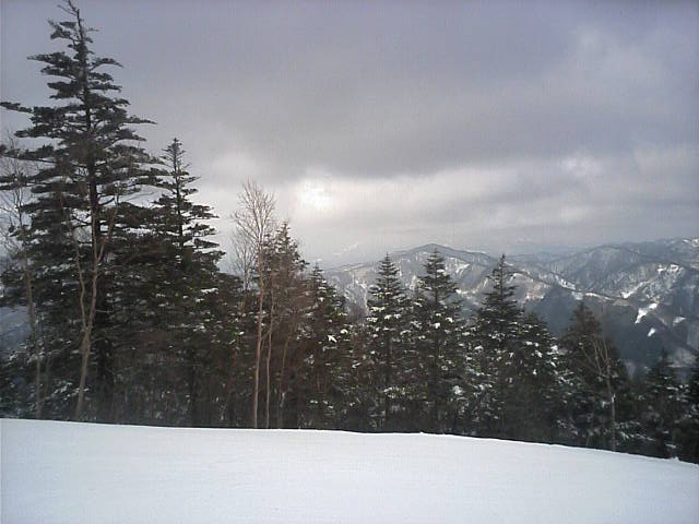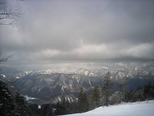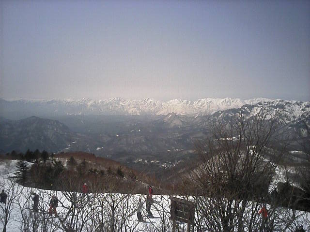 中腹での大休止中の対面の山の風景。野沢~志賀高原の景色を独占です。掛け値なしのプライベートスキー場でした(笑) 14:11~