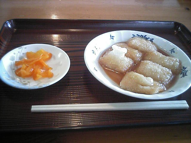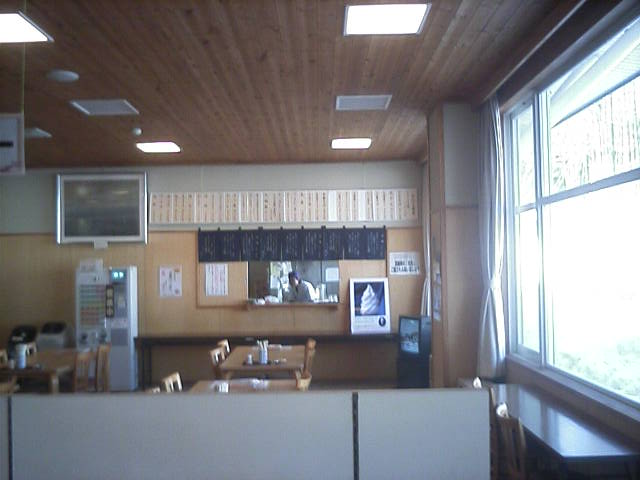 HEAD MAGNUMを試乗中、docatさんからBBSに書き込みがあったようで、中腹の「やなぎらん」に居るとの事で向かいました。店の外から板を持って店内に振っていたら気付いてもらえ、ここでお会いできました。左docatさん、右局長さん