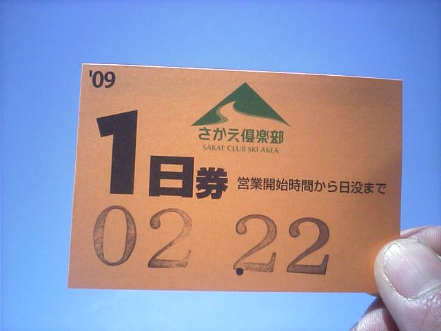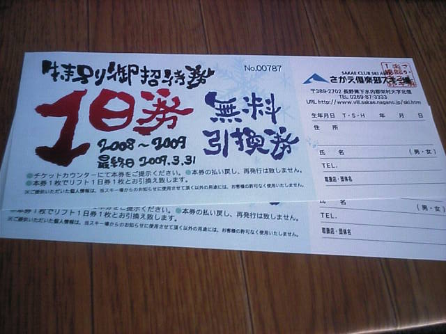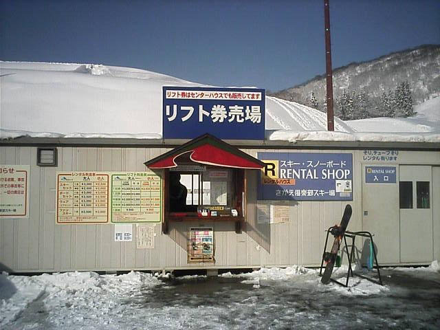 左:WNチェックでは絶好のスキー日和。 中左:POPスノーさんからいただいた支援券。 中右:チケセンはプレハブ? 右:視認タイプの1日券。何故か裏面には住所氏名電話等の記入欄が…。