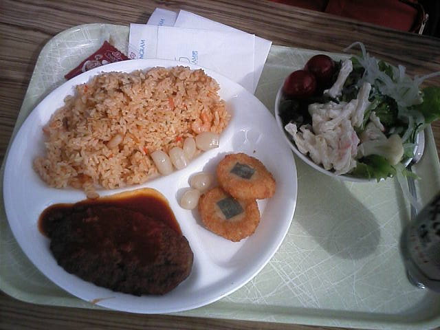 ゴンドラの待ちが30分以上かかりそうな位並んでいたので早めに食事にしました。ゴンドラ搬器でみた画像が美味そうだったステーキ重を狙ってわたすげに入りました。@900×3枚に追金2野口ですorzステーキの上に乗っているのはたまねぎのリング揚げで、ミニ丼はマーボー豆腐でした。