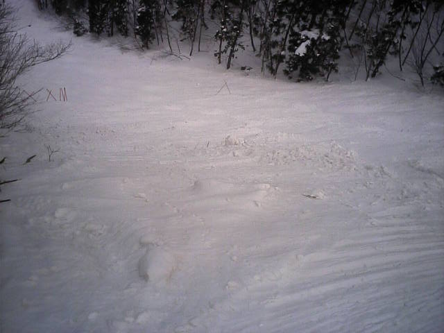 急斜面のニューパラダイスの右端の狭い部分ですが、ここも脛~膝でした。抵抗がかかり、幅が狭くても直線的に滑れました。