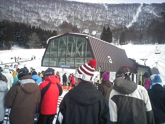 左:いつものWNチェック。午前中は期待できそうです!中左:前売り@3500で@900のランチ券付き。切り離して日付押印してそのまま使えます。岩岳と違って合理的。中右:IDチップ保障料だけでも4野口w右:8:26ゴンドラ待ちへ並びましたが、この程度なら空いてますね。