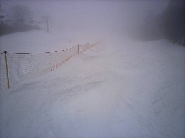 残念ながらこんな視界なので高速滑走は試せませんでした。整地ではしっかりグリップしカービングが綺麗に決まる感じでしたが、視界が悪くて滑走跡を確認できませんでした。ラッツ・ラッツ後半にはバンクコブ作成用のポールが立ててありましたが、間隔が6mとの事で、間延びしてリズムが合いませんでしたorz
