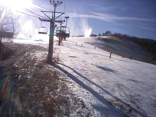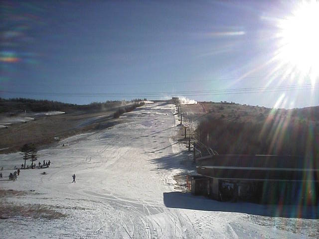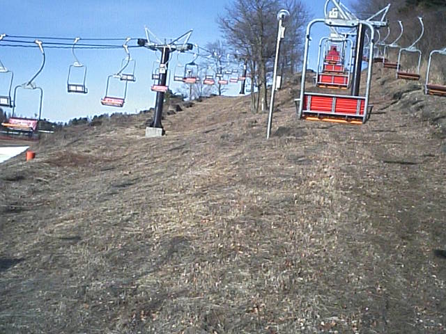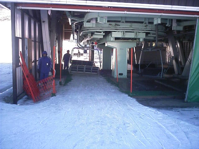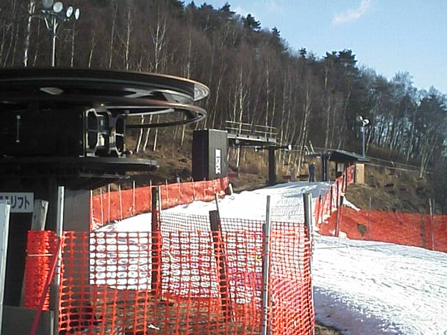 ゲレンデの雪は全体的に薄いのですが、リフト乗り場は更に薄いです。ここは緑のマット?の上に1cm程度。凍っているので引っ掛かる事はありませんでしたが、もう少し欲しいところ。降り場はやや厚めでしたが、最初の着地地点に全く無く、ゴムマットだったので、たまに引っ掛かりました。
