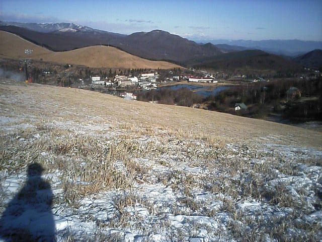 ハイシーズン中は此処にも雪が付き高低差で滑り込めるのですが、今日はご覧の通りで、下部リフト降り場までゆるやかな登りを歩きました。