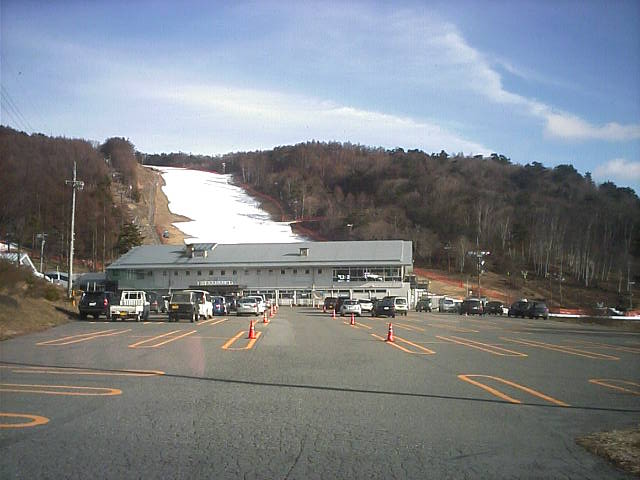 遠くて判りにくいですが、中央部にハーフパイプがあります。底に若干おこぼれ的降雪があります。パイプ用のピステンは画像左側の奥の駐車場に置いてありました。