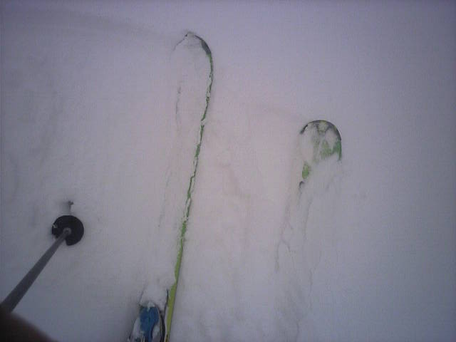 14:16 こんな感じの雪です。この量ですから浮遊感は皆無ですが、軽いので楽々回れます。凡打製造機も余程楽しいらしく、果敢に新雪ゾーンへアタックしていました。