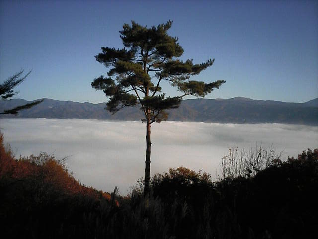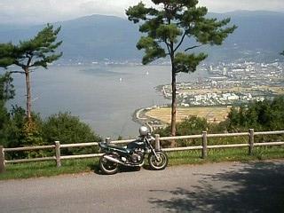 松の木の右側が自宅方向で左側が諏訪湖です。