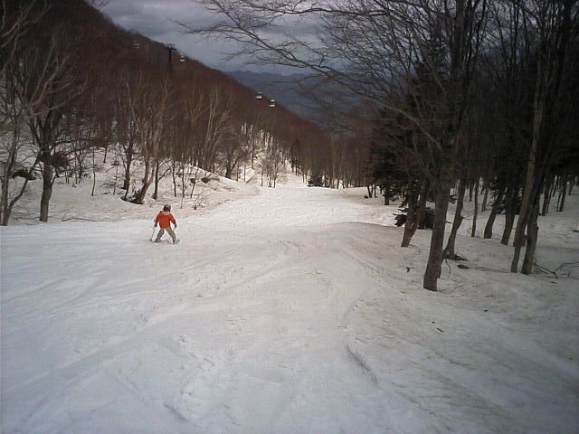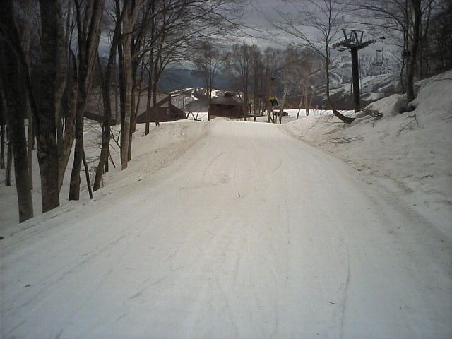 ゴンドラで上がっても、ハンの木G下部辺りも雪はありません。松本のJrレーサーに聞いた情報では先週(4月13日)までは最下部まで滑り込めたとの事。雨が多かったからか、加速度的に融けてしまったようです(泣)