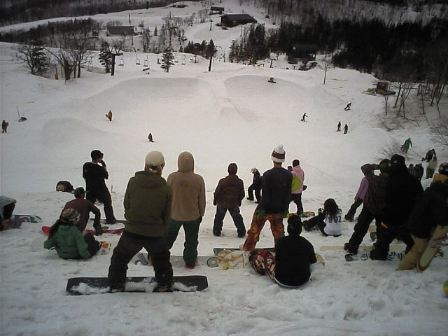 特筆はBOWL SESSIONでした。ハーフパイプの下部に壁を付けて球面に仕上げた感じ、と言えば良いのでしょうか?1/4球面が二個並んでいました。アプローチ部分には大きなバンクもありました。珍しいアイテムなので暫し見惚れてしまいました。まだ遊び方が確立?していない様で、右回りと左回りの人が同時に入って、追突回避したり、中心の壁を乗り越えてしまい隣のボウルへ飛び込んだり、見ていてヒヤヒヤする場面も有りましたが、上手なプレイには歓声やどよめきが上がっていました。見ている範囲ではスキー板の使用者は居ませんでしたが、とても面白そうでした。(年考えろ!←陰の声)