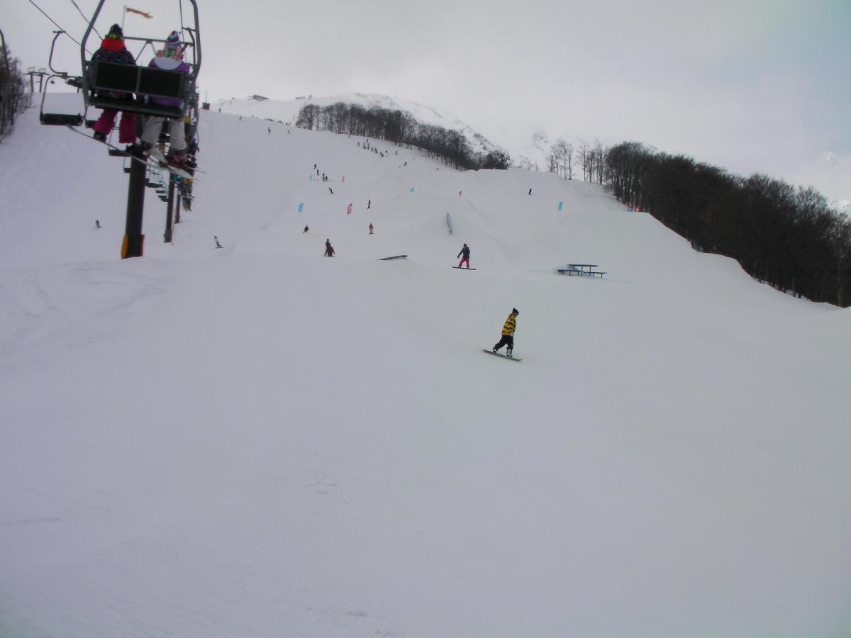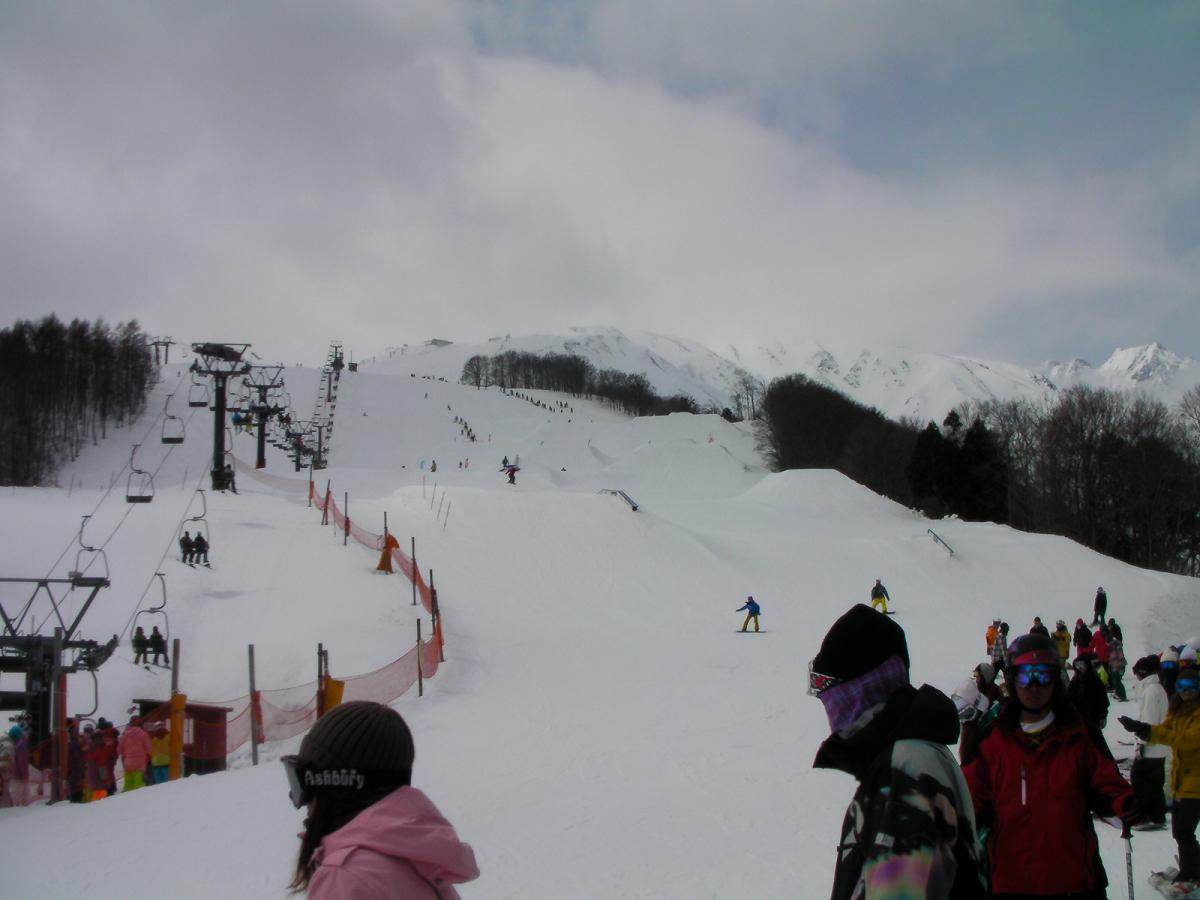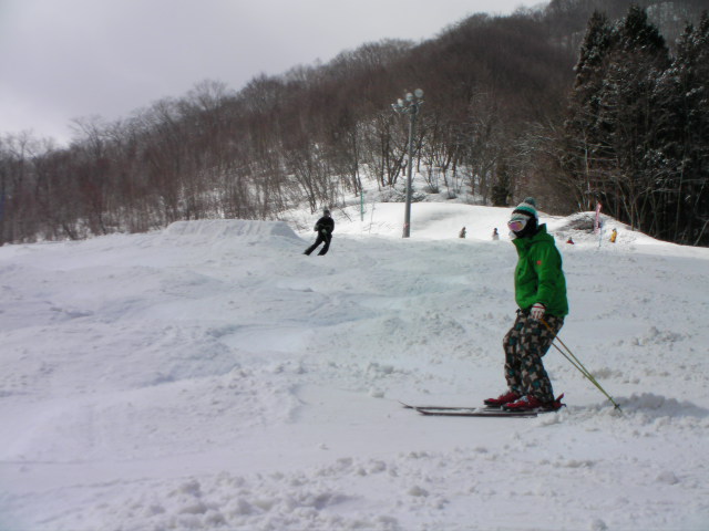昨年はこのゲレンデの左端にこっそりと存在している感じでしたが、今年は右半分位をセパレートして大きなパークになっていました。種類は少ないものの長く流せるレイアウトのようです。キッカーも小さめでしたので、少し飛んでみました。最後は単調な緩斜面にウェーブがあるのでタラタラ滑らずに、少し楽しめました。
