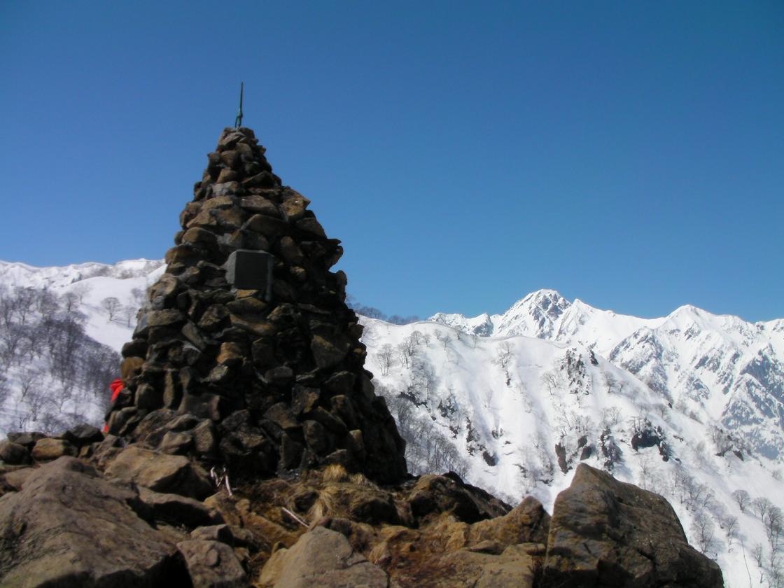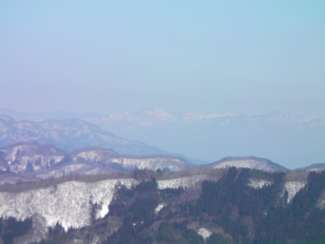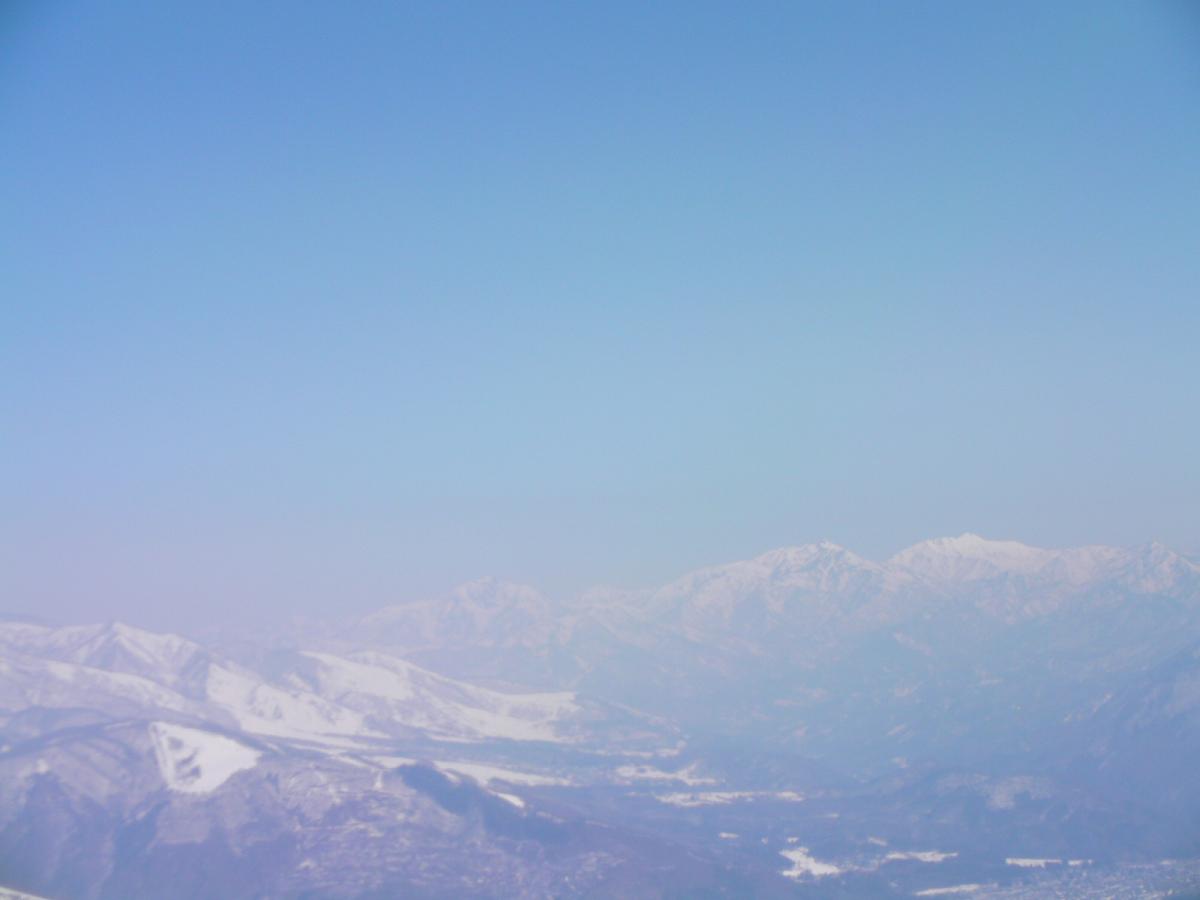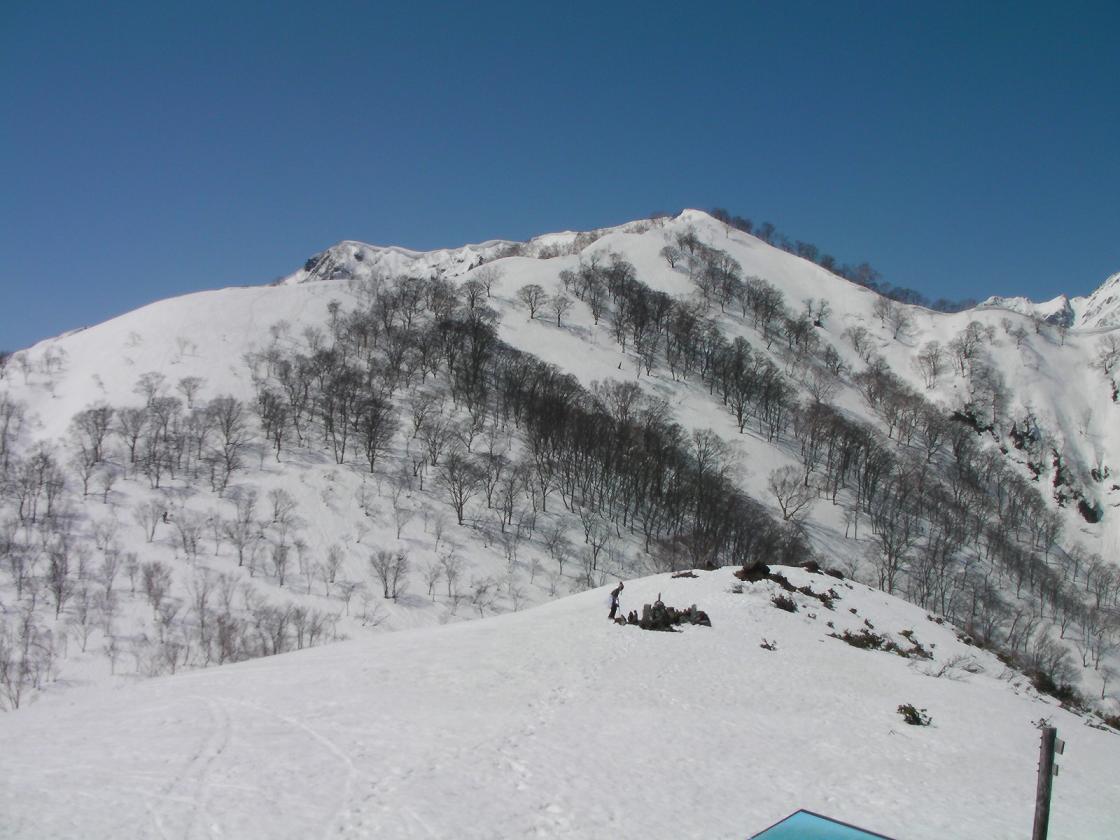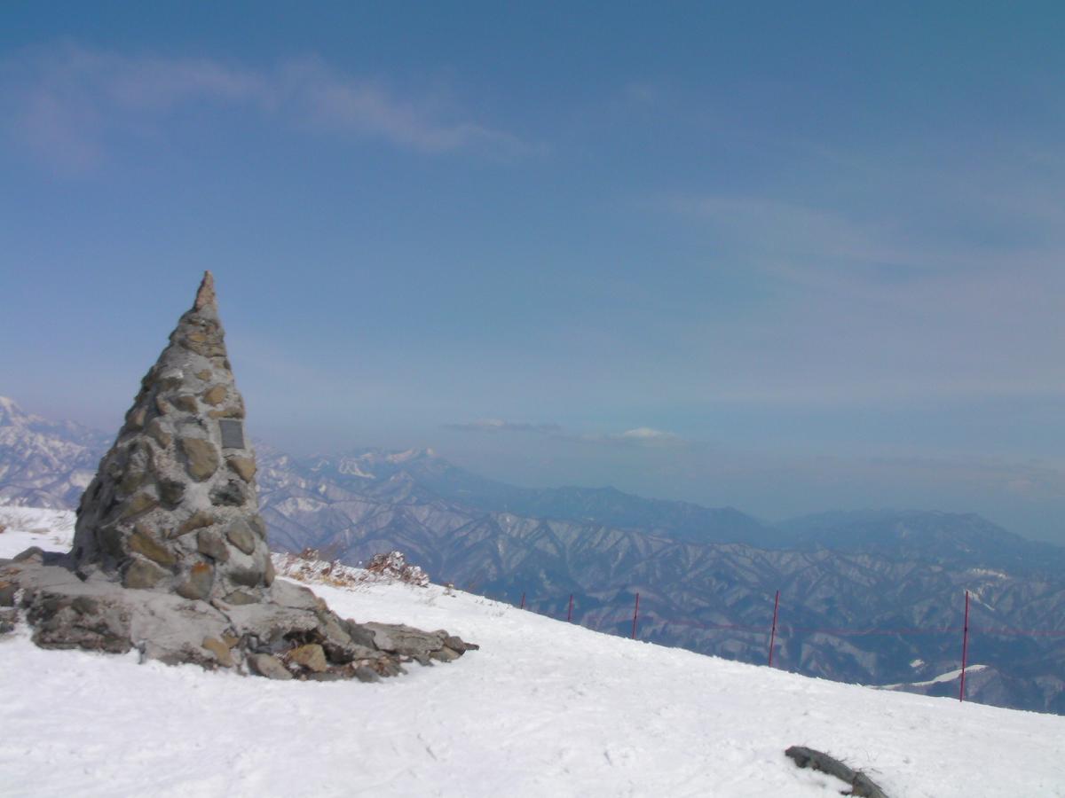 大町スキー場の廃止コースの山頂風景です。午後になって風が出てきましたが、相変わらず快晴が続いています。