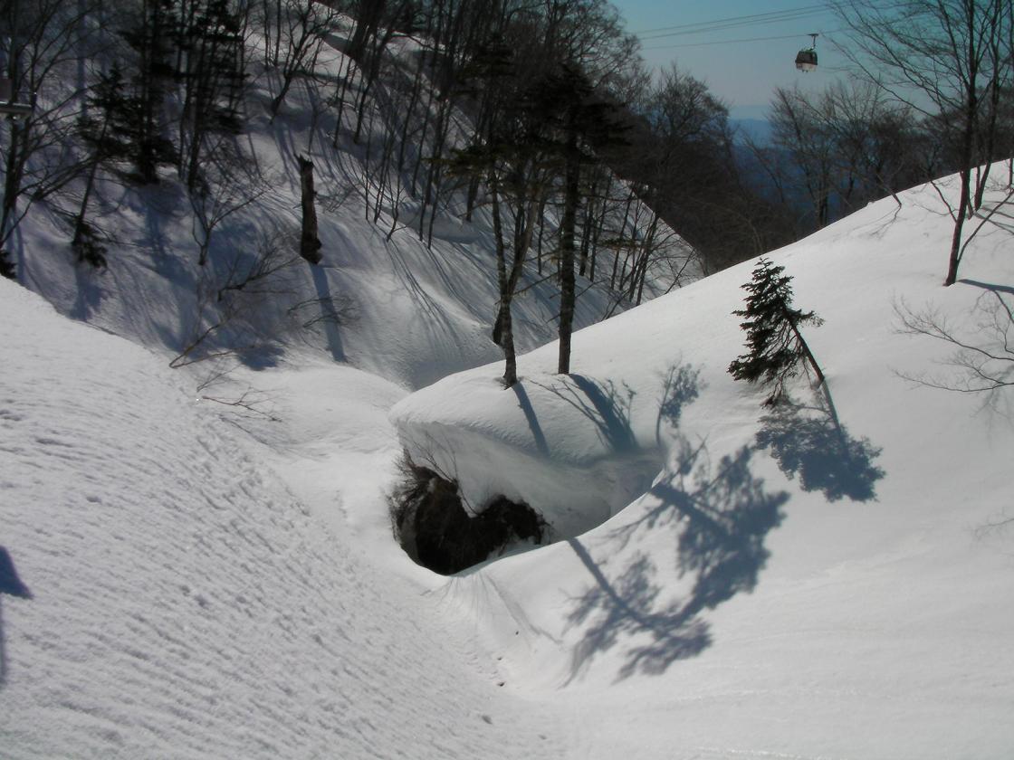 栂の森左側の未圧雪部から続けて御殿場コースへ滑り込みました。雪の量が多いので整地した所は地形はすっかり隠れてしまい面白みに欠けたので、ちょっと脇へ入って遊んでみました(笑)
