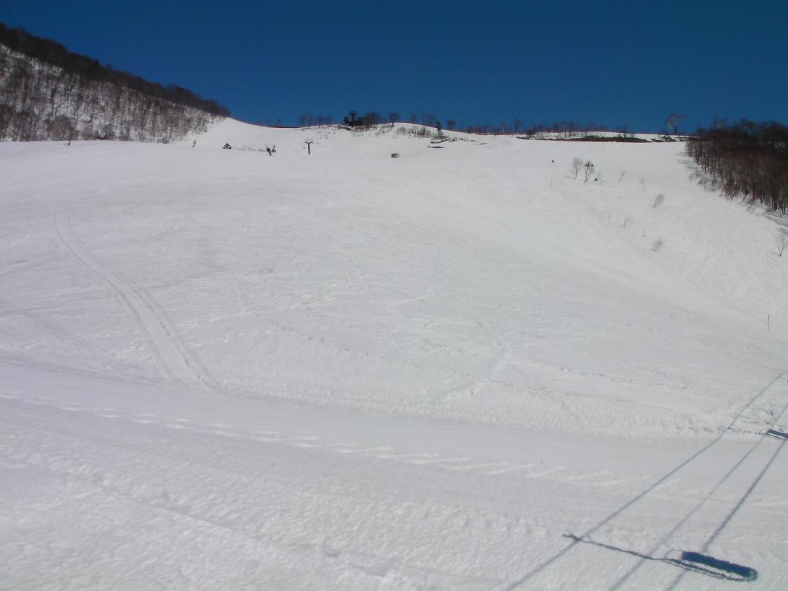 午後にはゴンドラもガラガラになっていたので、ハンの木上部から右手のラインで鐘の鳴る丘への登り返しまで通しで滑ってみました。下部の所にはあまり踏まれていない新雪もありましたが、斜度が無いのでただ真直ぐ滑るだけで美味しくありませんでした。